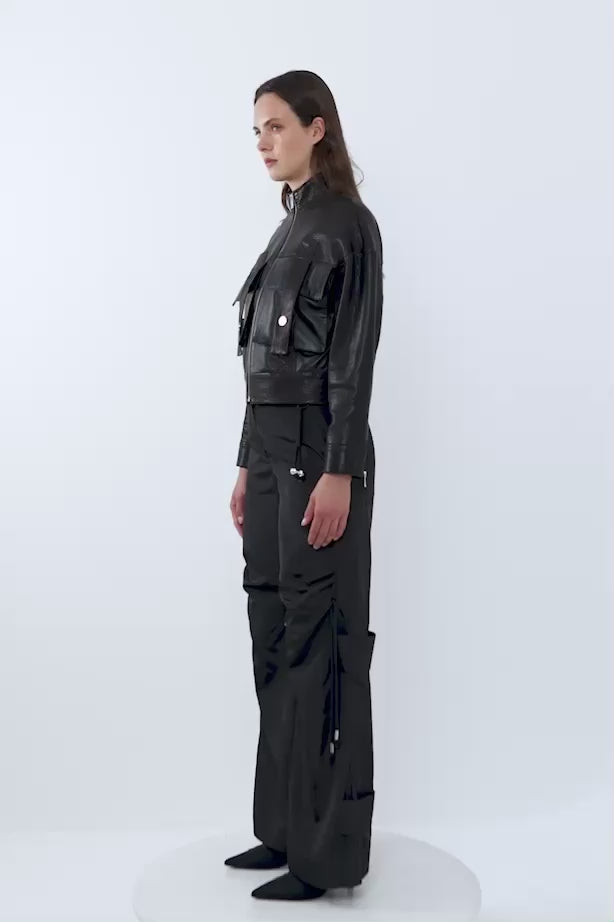 Dikiş Detaylı Volümlü Kollu Crop Deri Ceket
