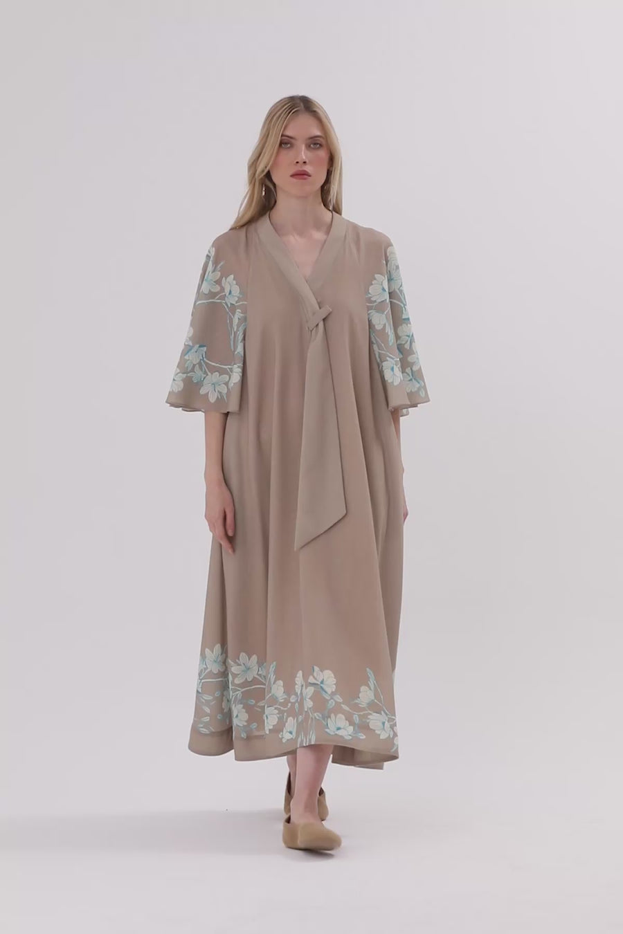 Volan Detaylı Bileği Lastikli V Yaka Desenli Uzun Elbise