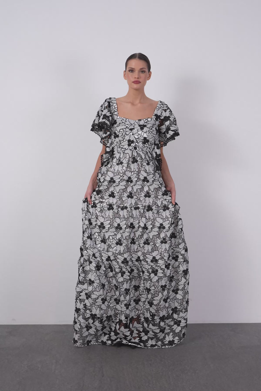 Volan Detaylı Yaka Bağlamalı Desenli Uzun Elbise