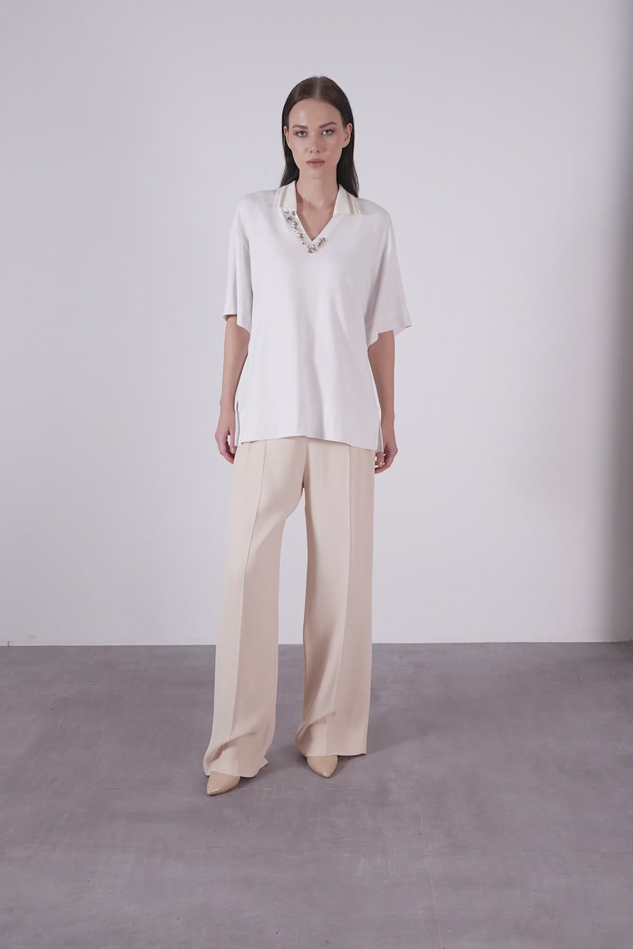Yakası İşleme Detaylı Kısa Kollu Basic Fildişi Tişört