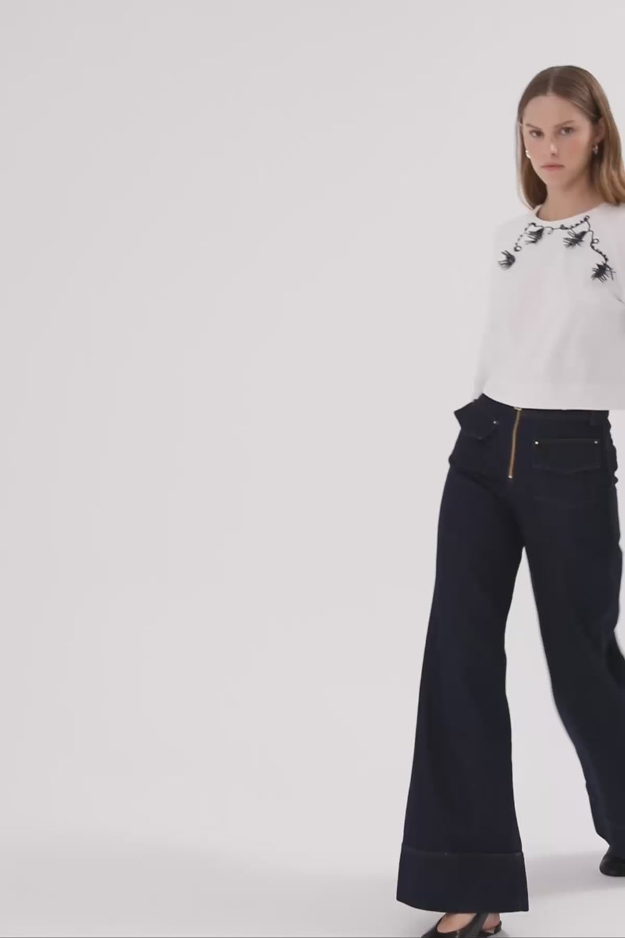 Yaka Ve Koları Nakışlı Boncuk İşlemeli Uzun Kollu Bluz