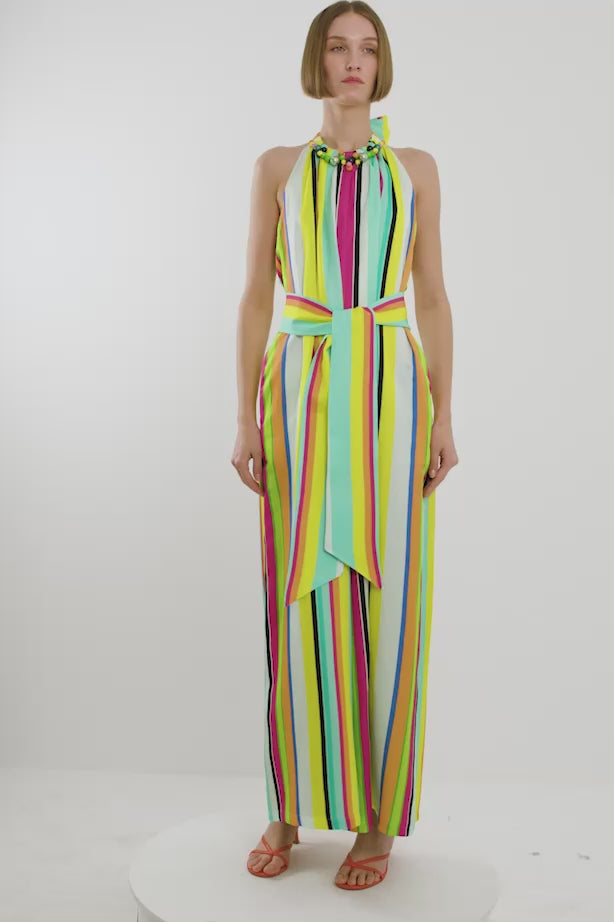 Yakası İşleme Detaylı Boyundan Bağlamalı Sırt Dekolteli Tulum