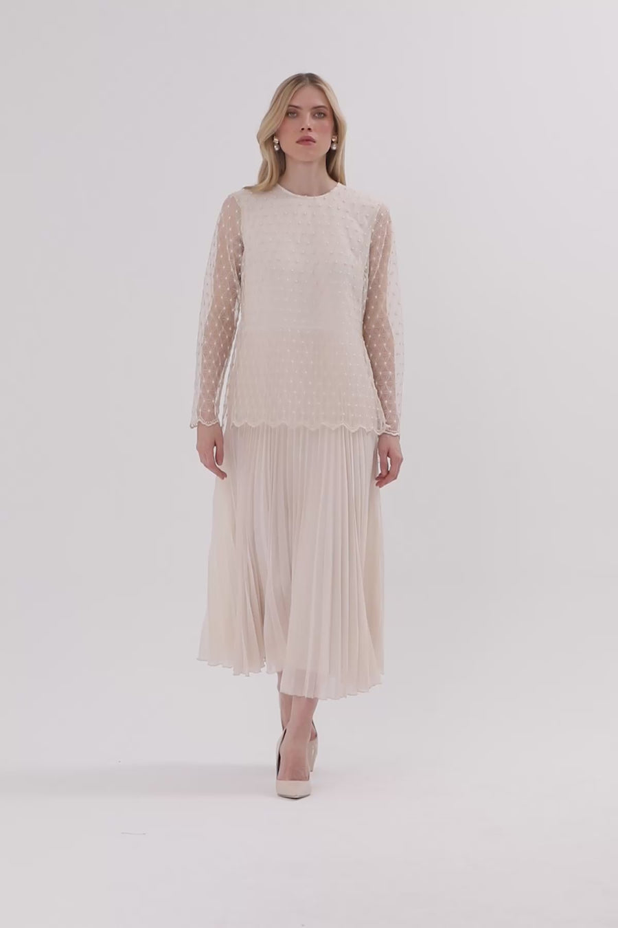 Kolları Tül Önü İşlemeli Ekru Kloş Mini Elbise
