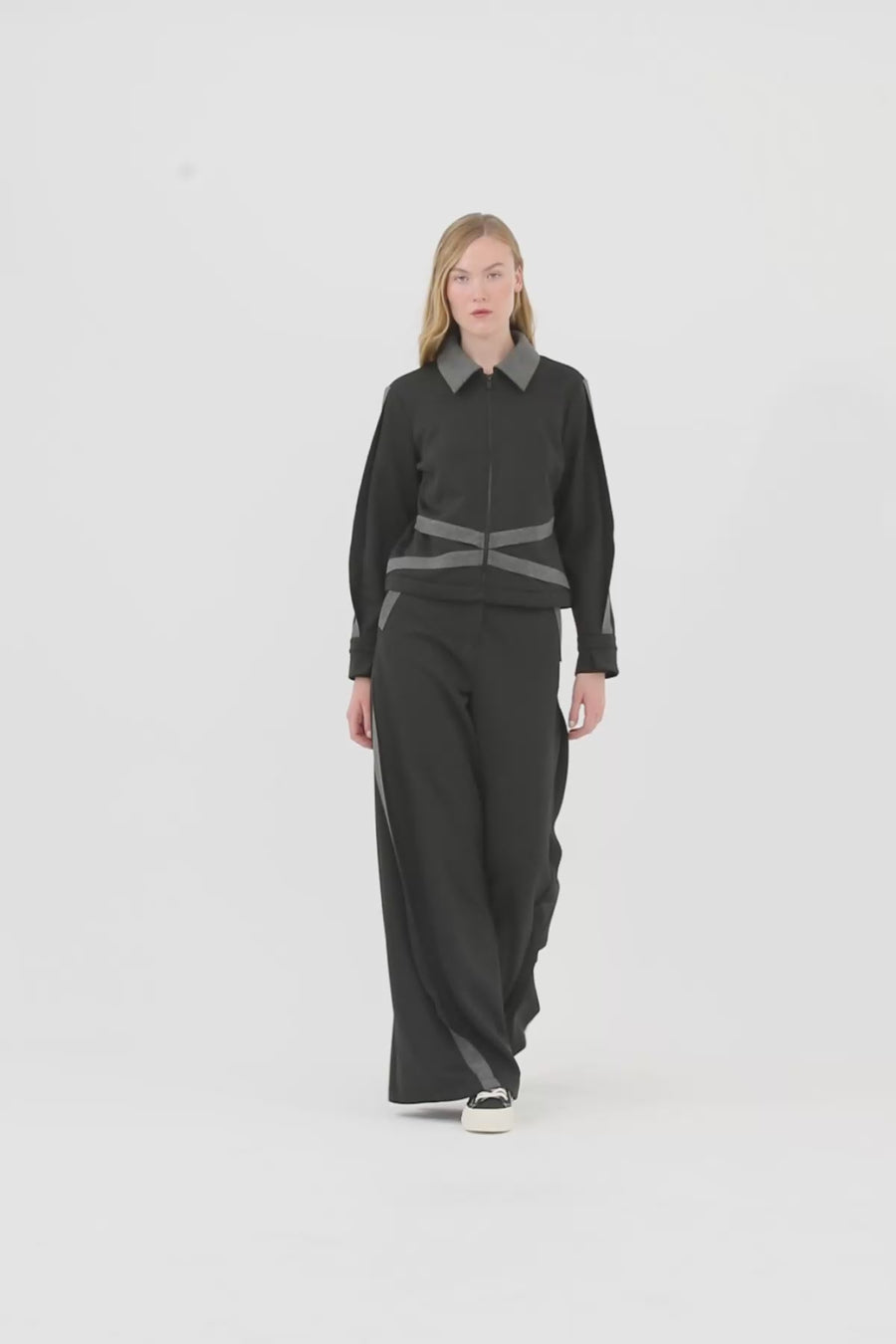 Kontrast Şerit Detaylı Yüksek Bel Geniş Paça Pantolon
