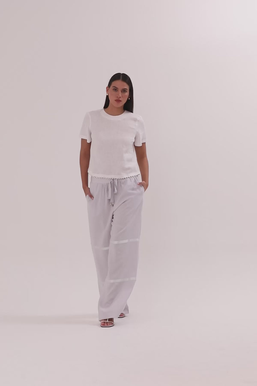 Kuşak Detaylı Bol Paça Keten Pantolon