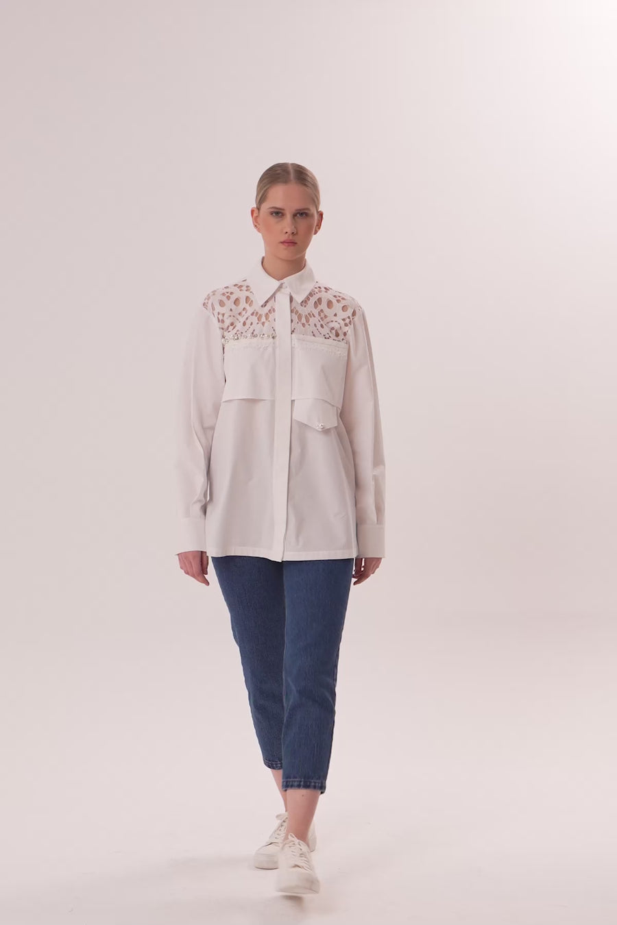 Manşetleri Boncuklu Düğmeli Klasik Gömlek
