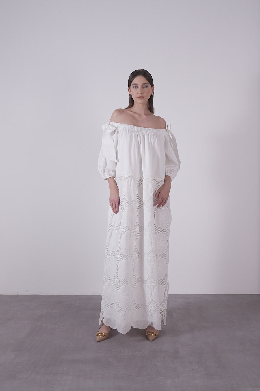 Lastikli Kayık Yaka Kat Kat Çiçek Desenli Uzun Kloş Elbise
