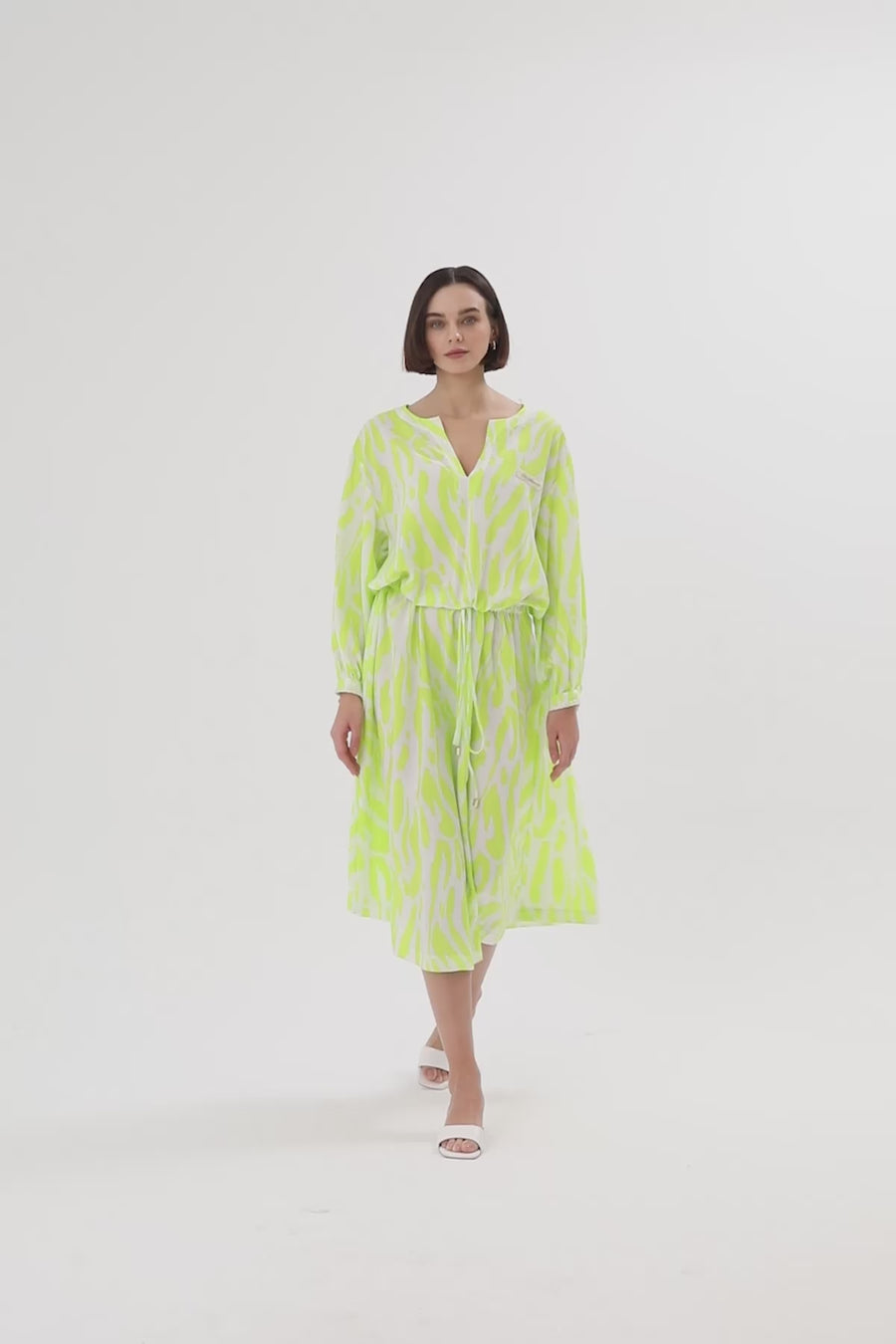 Beli Kuşak Detaylı Kolu Lastikli Desenli Kloş Elbise