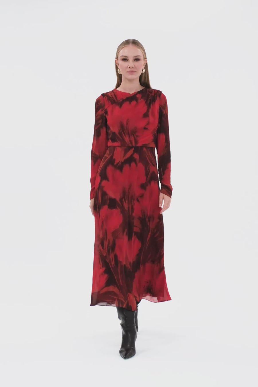 Yuvarlak Yaka Fermuar Kapama Omuzdan Büzgülü Elbise