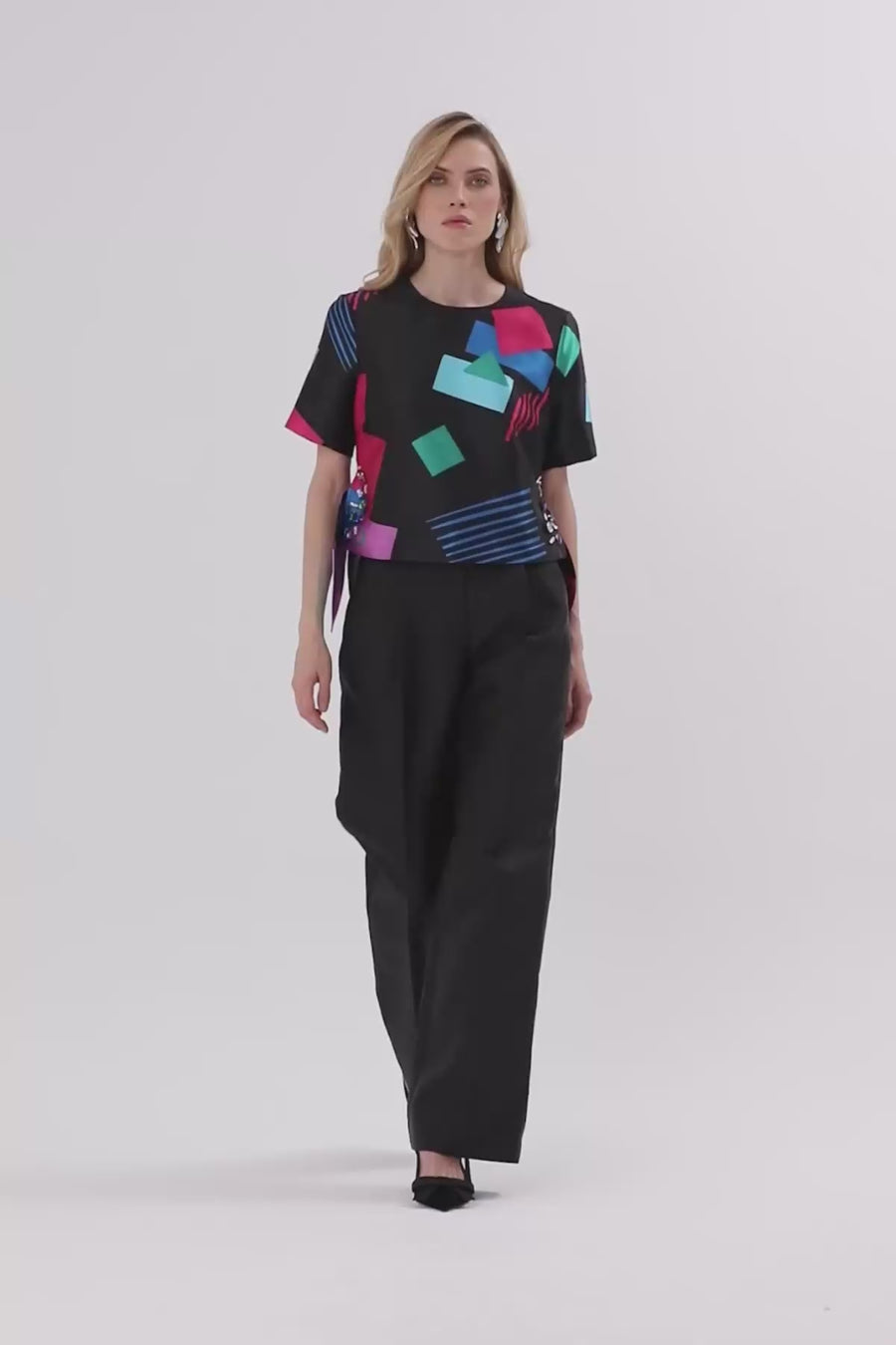 Geometrik Desenli Yuvarlak Yaka Renkli Bluz