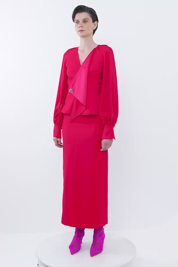 Yandan Yırtmaçlı Boğazlı Dökümlü Saten Bluz
