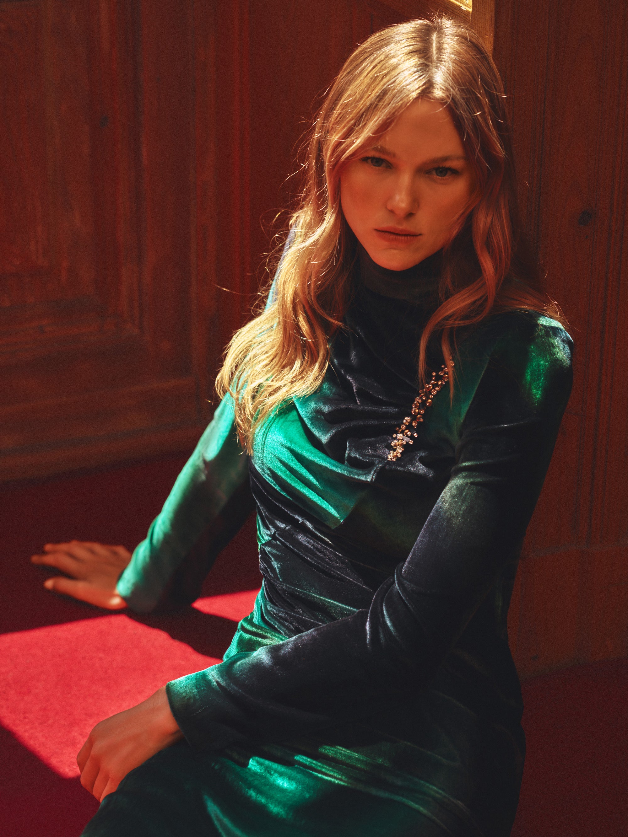 Yakası İşlemeli Kuşaklı Saten Abiye Elbise