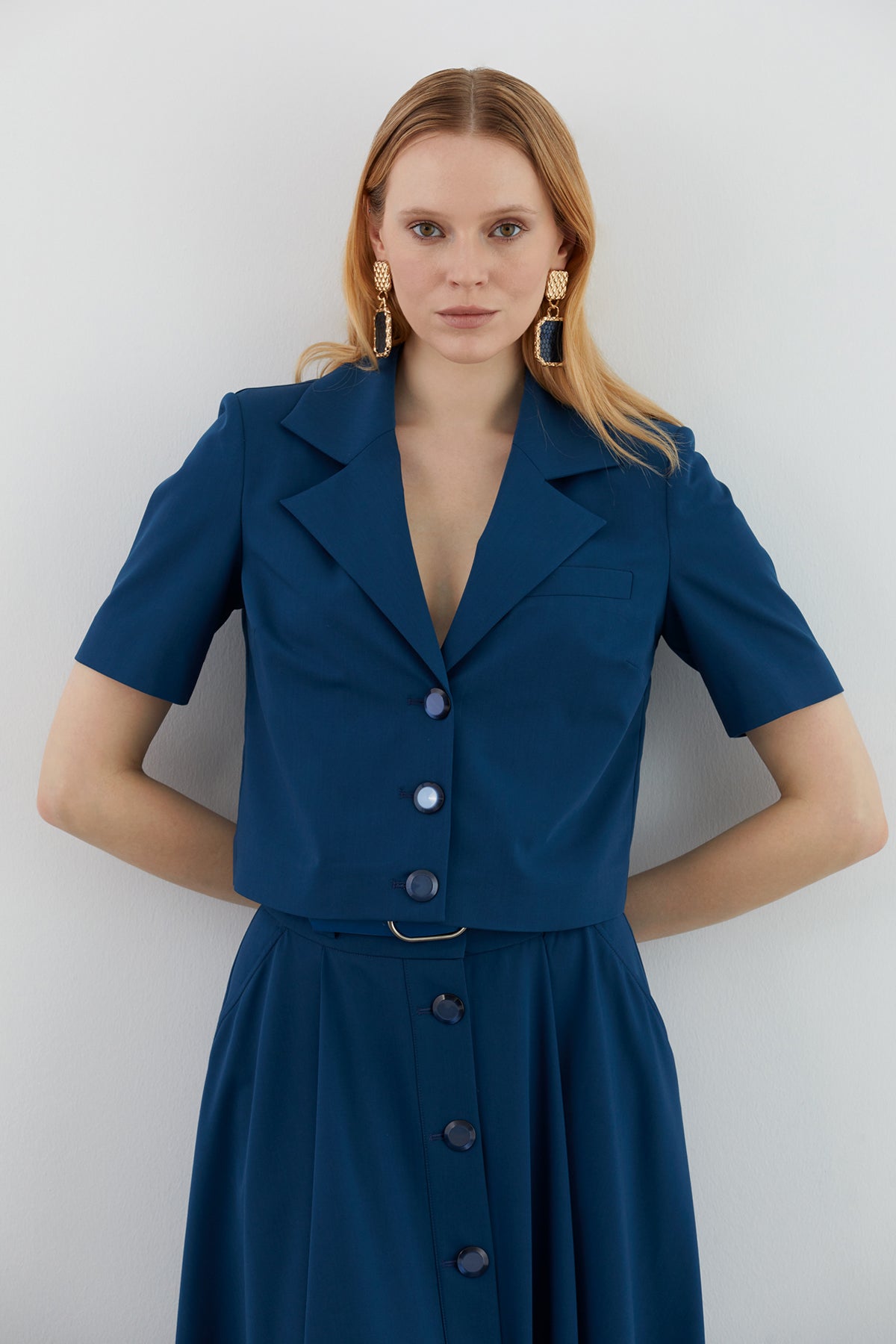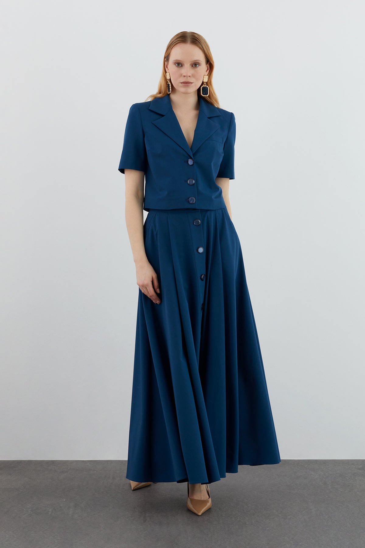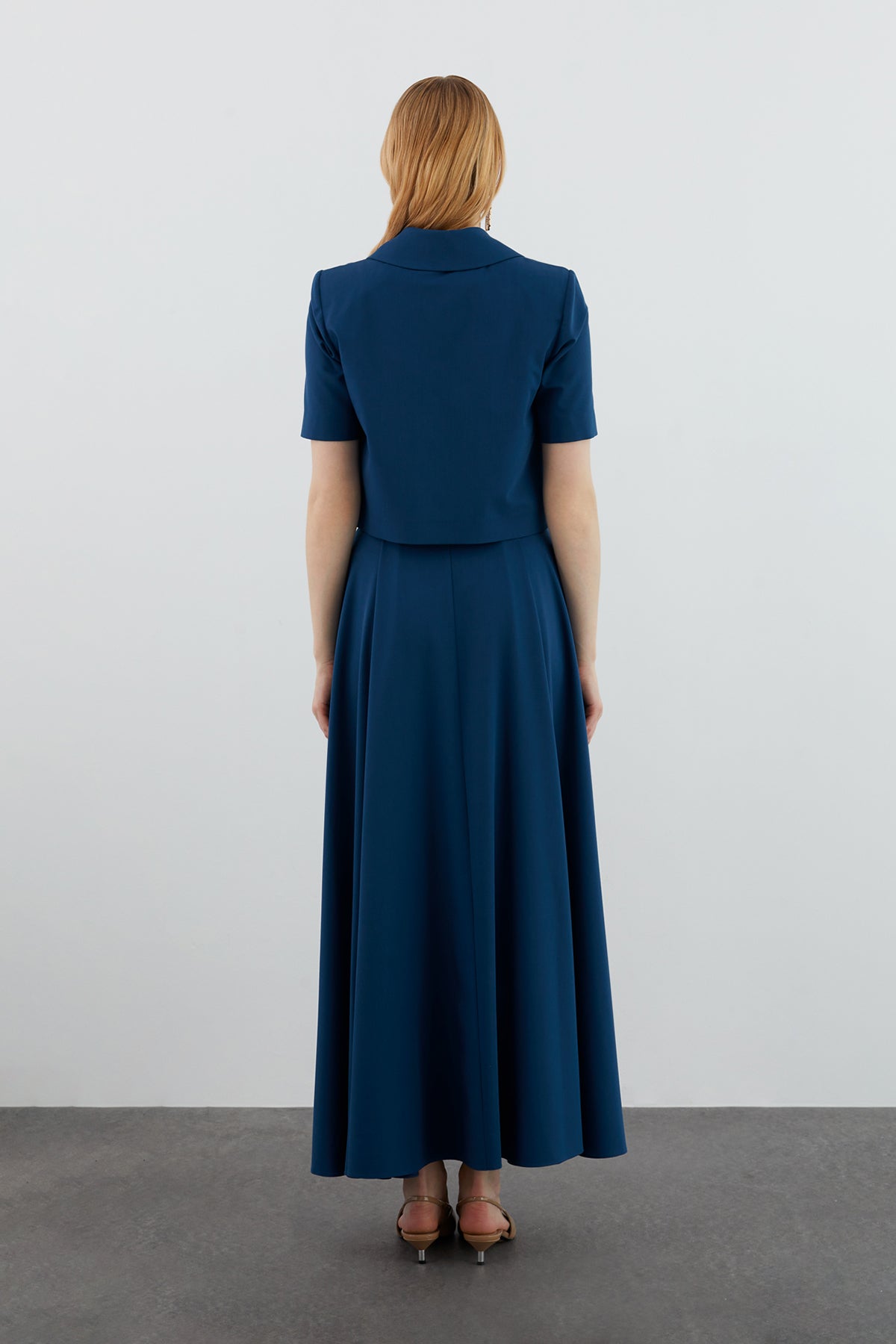 Kısa Kol Crop Ceketli Kloş Etekli Kemer Detaylı Koyu Takım Elbise