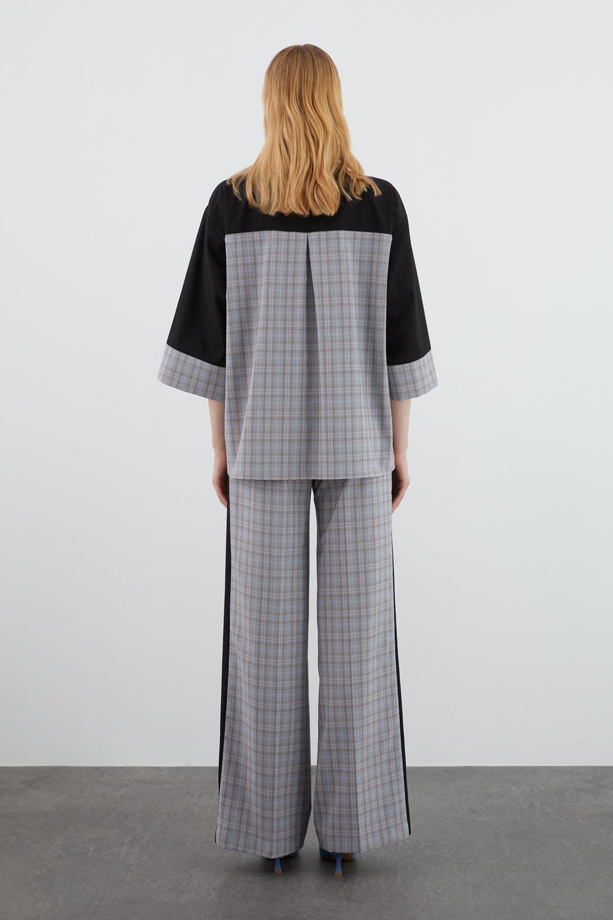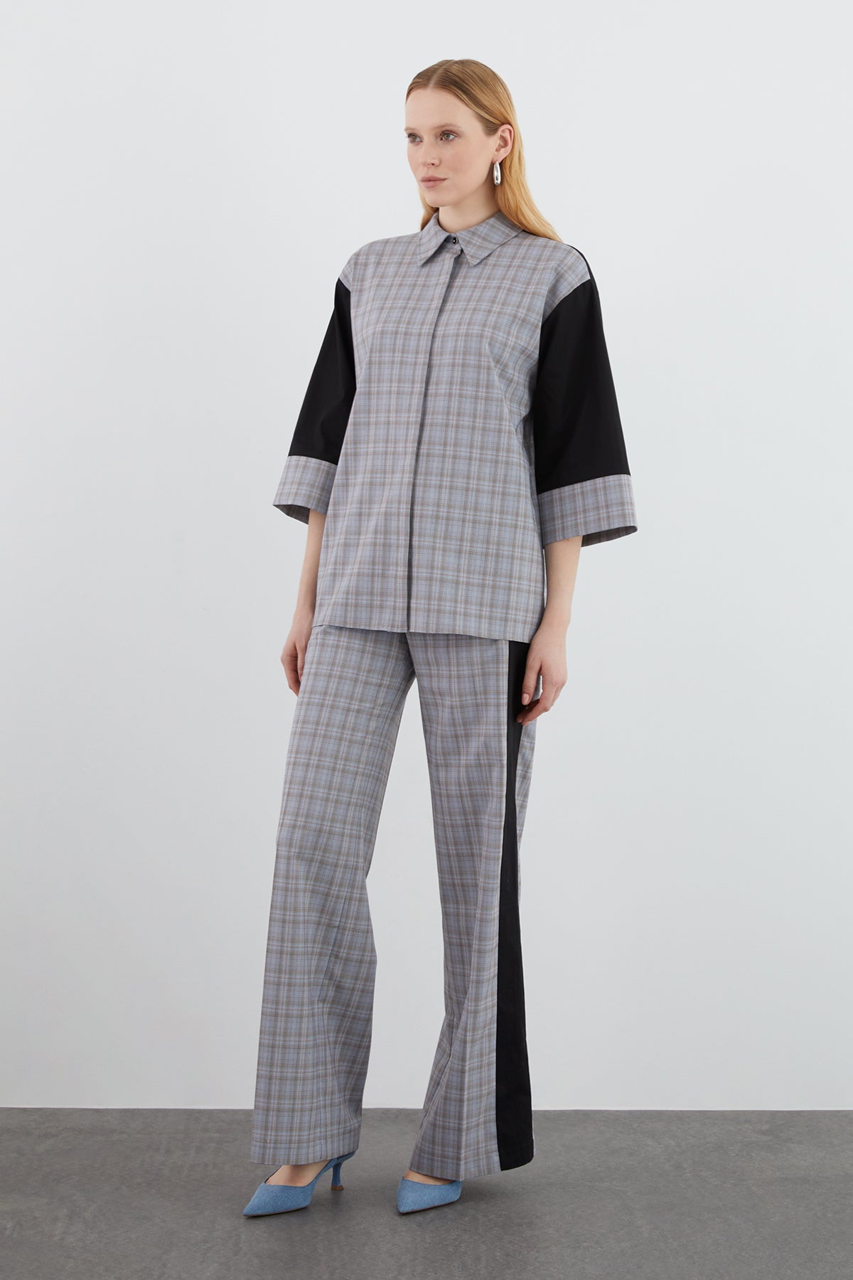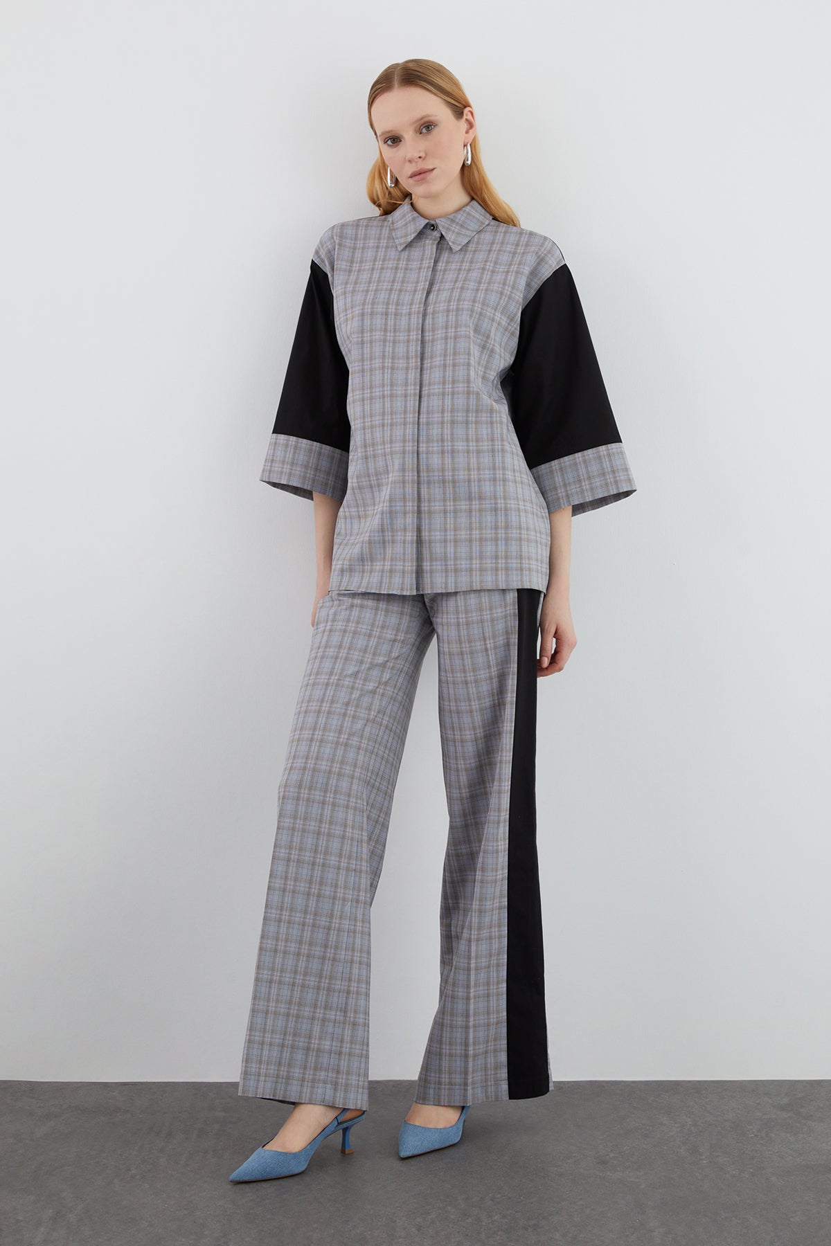 Gömlek Yaka Detaylı Ceket Ve Palazzo Pantolonlu Ekose Desenli Takım