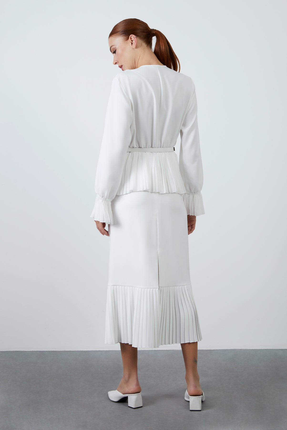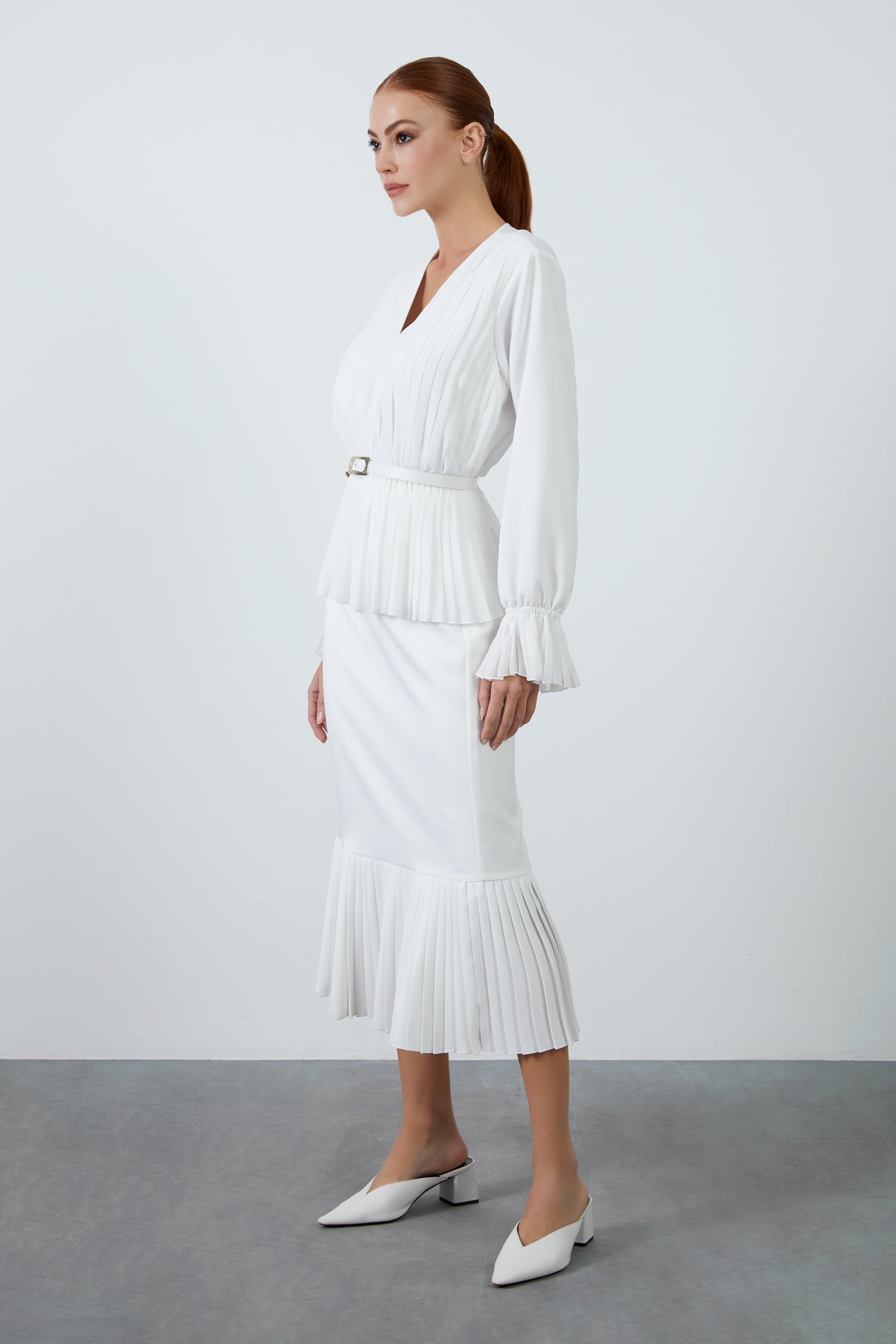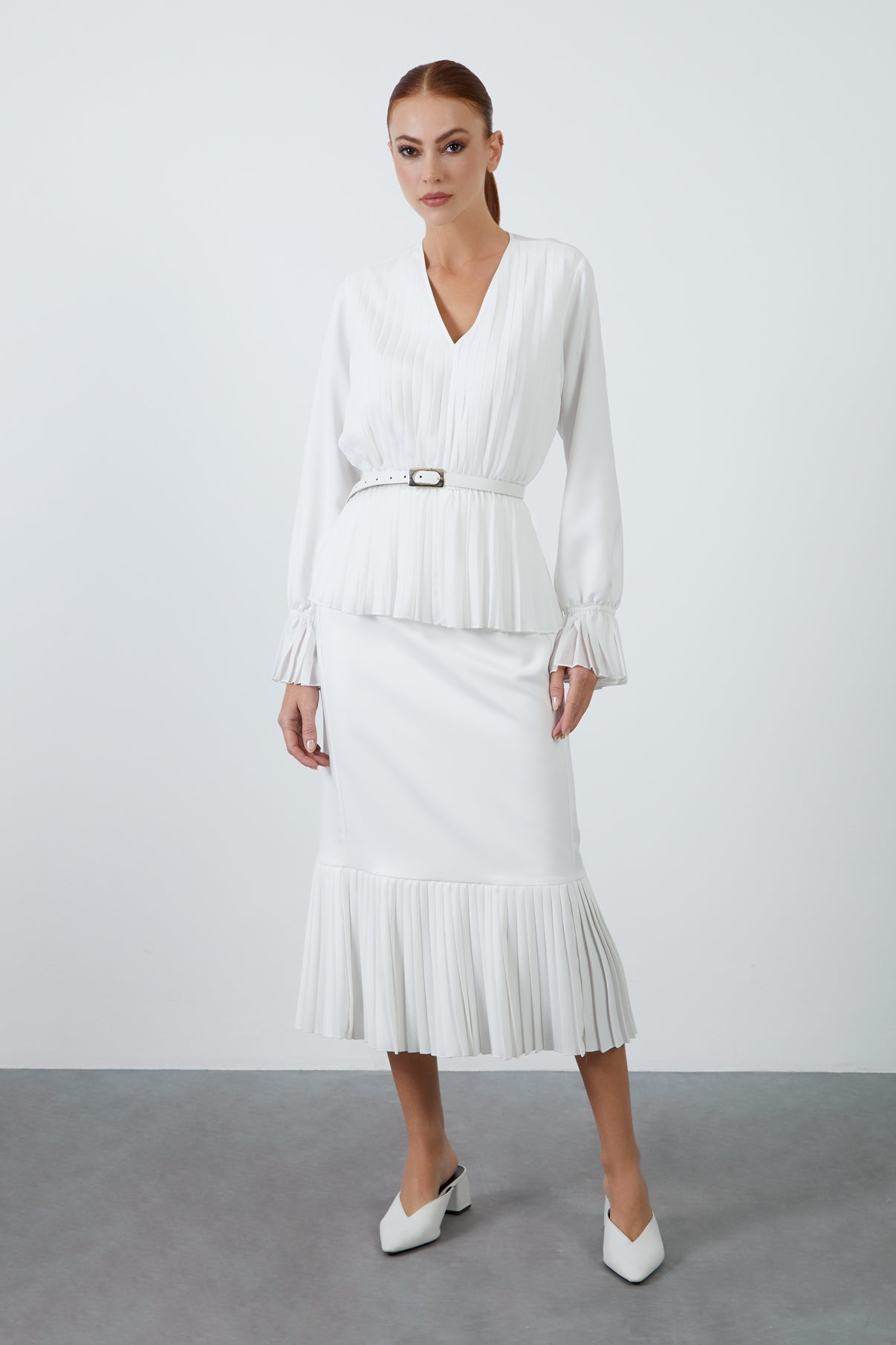 Beli Kemerli Pliseli Etek Ve V Yaka Bluzlu Takım