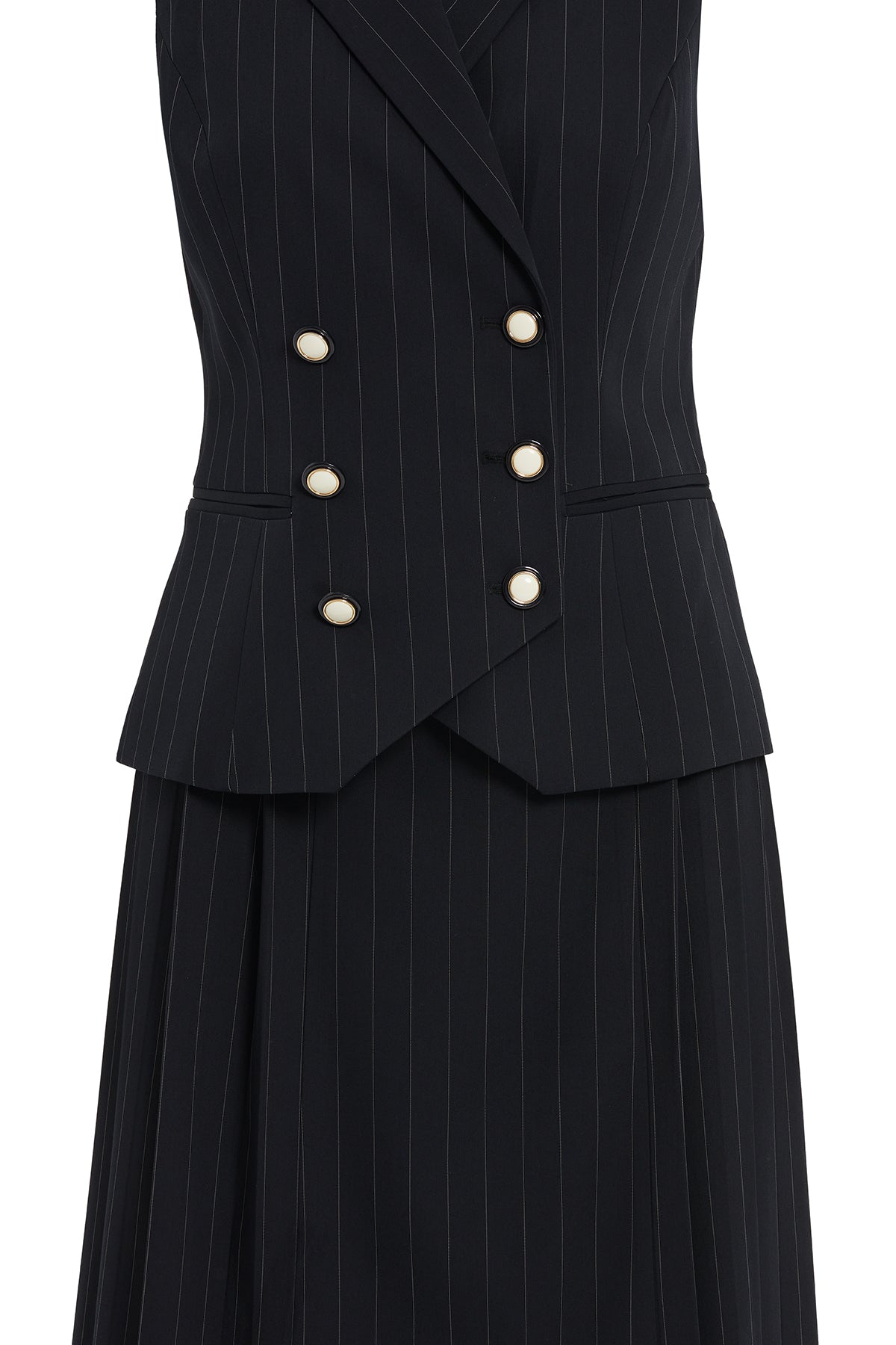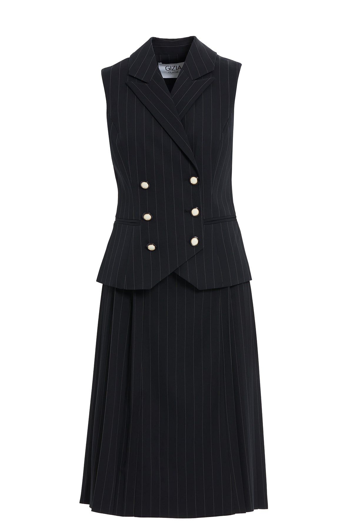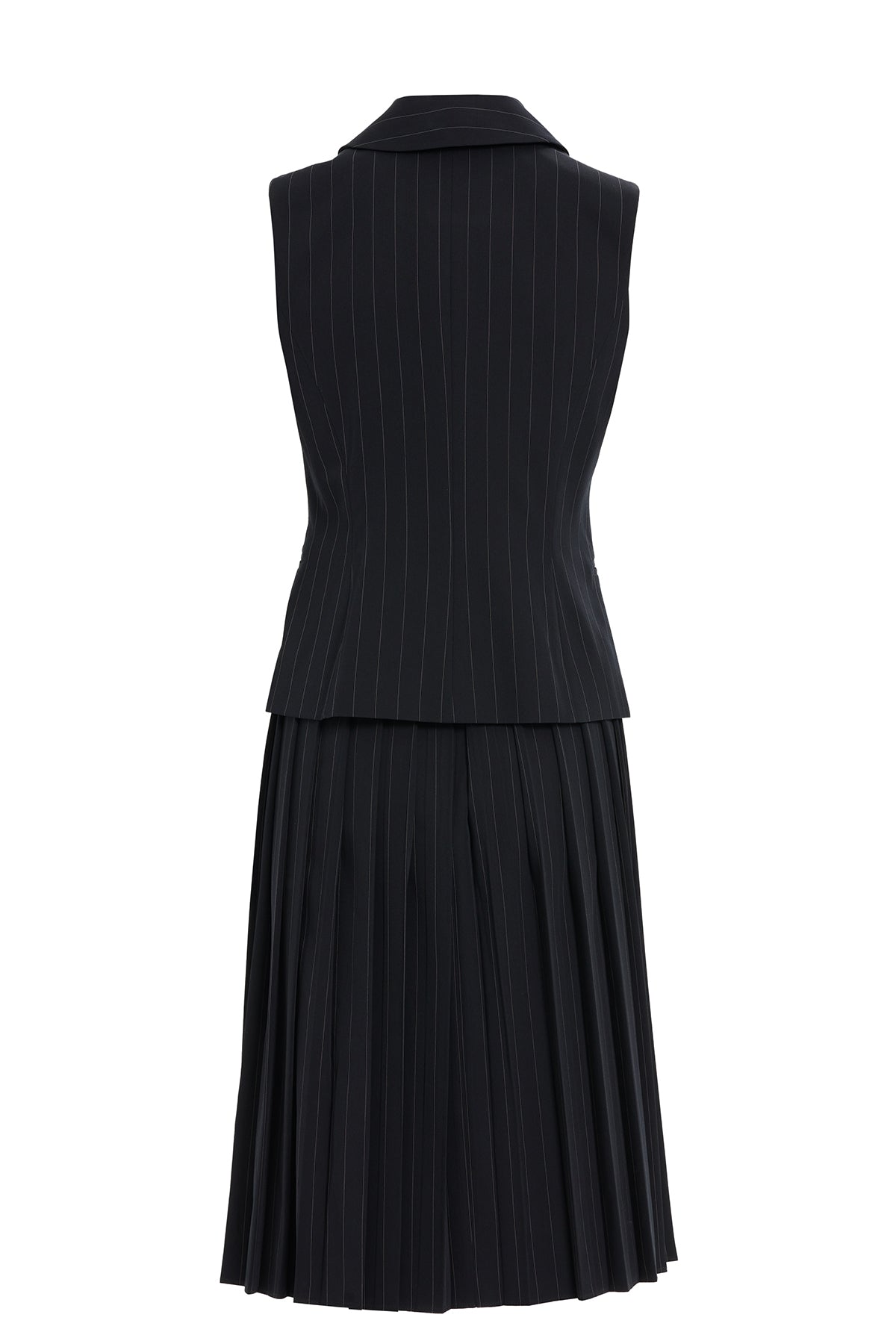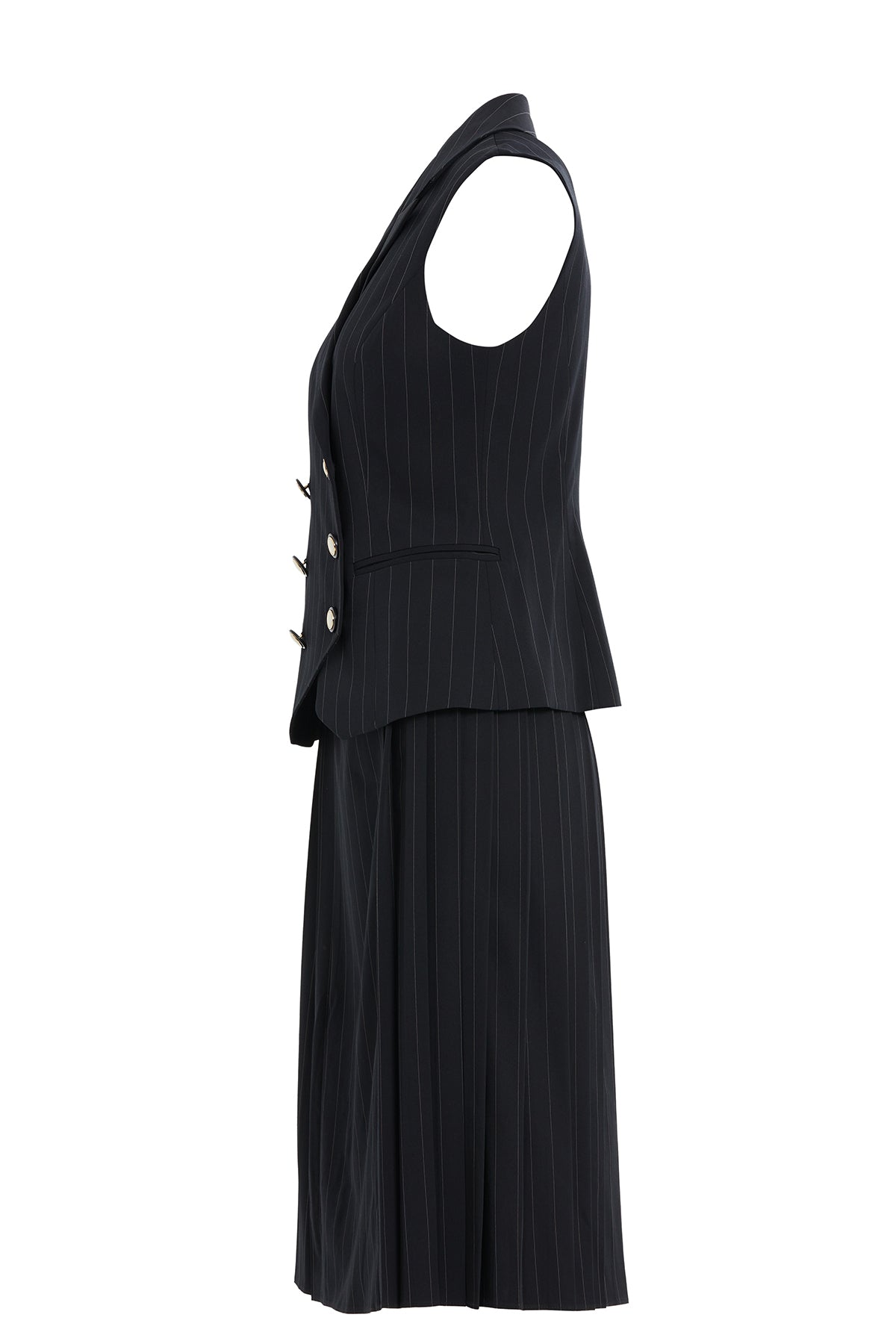 Kruvaze Kapamalı Kısa Kol Yelekli Midi Etek Pilise Detaylı Çizgili Takım