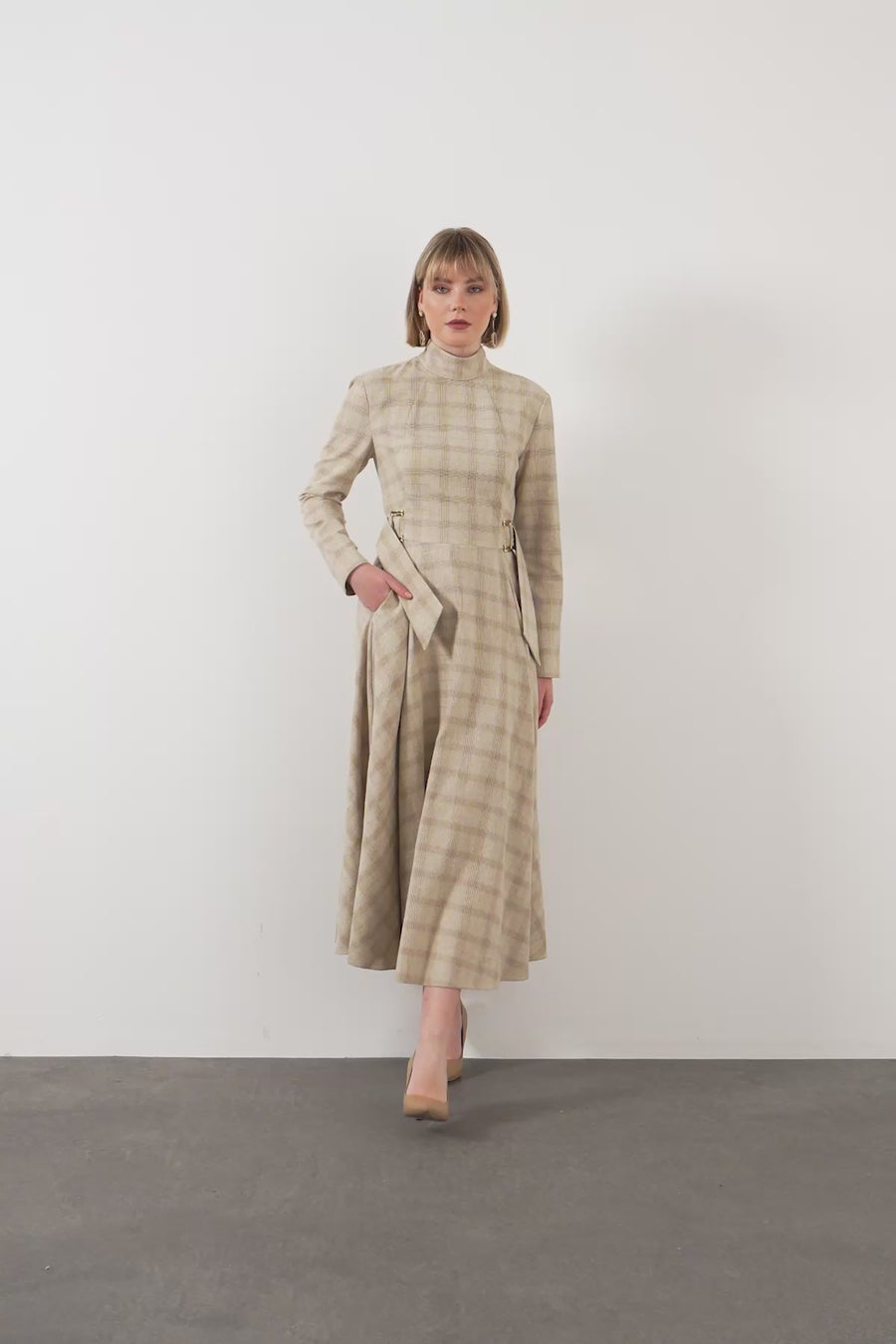 Dik Yakalı Tokalı Kuşak Detaylı Midi Boy Astarlı Elbise