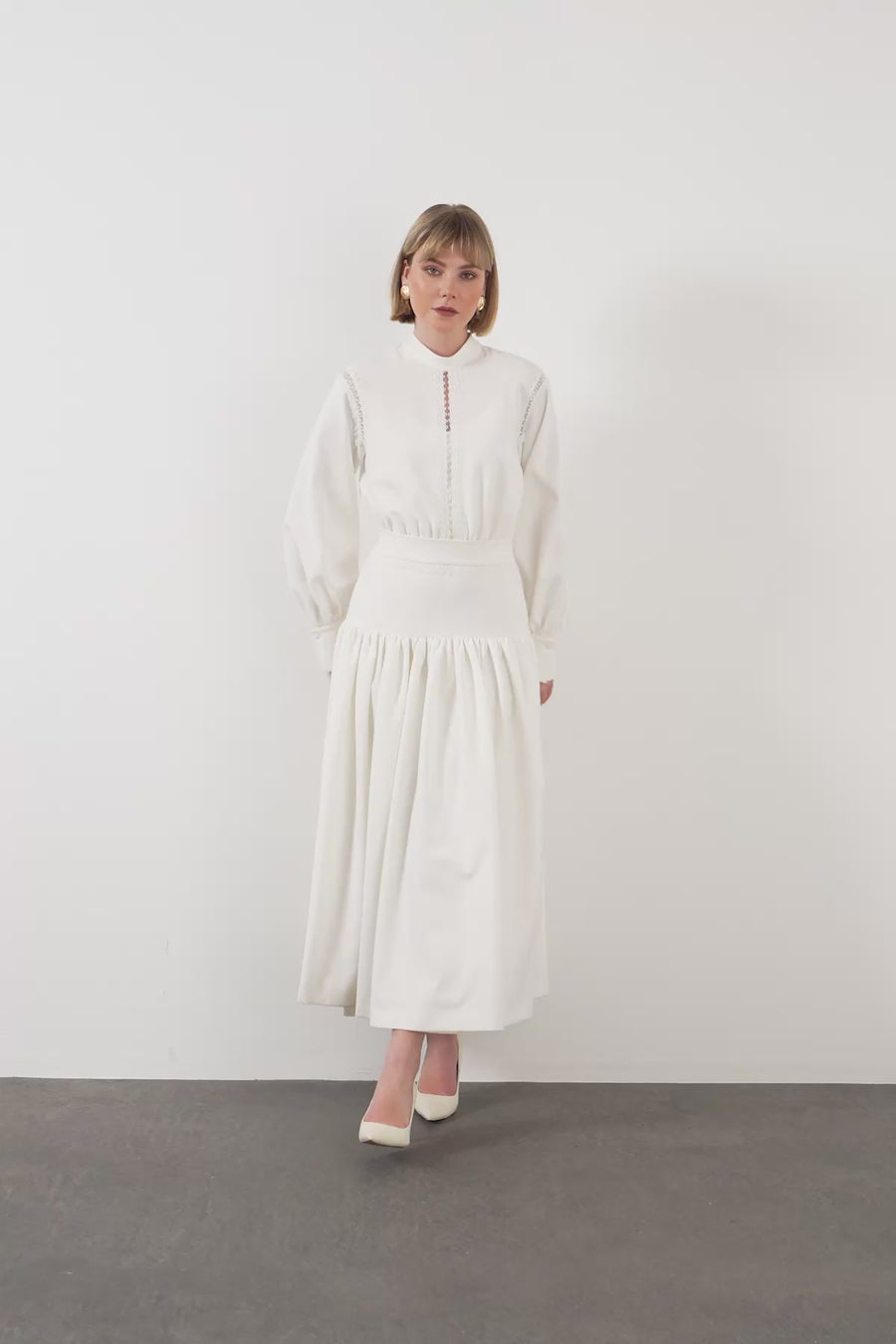 Yaka Su Damla Kesim Detaylı Eteği Kloş Midi Boy Elbise