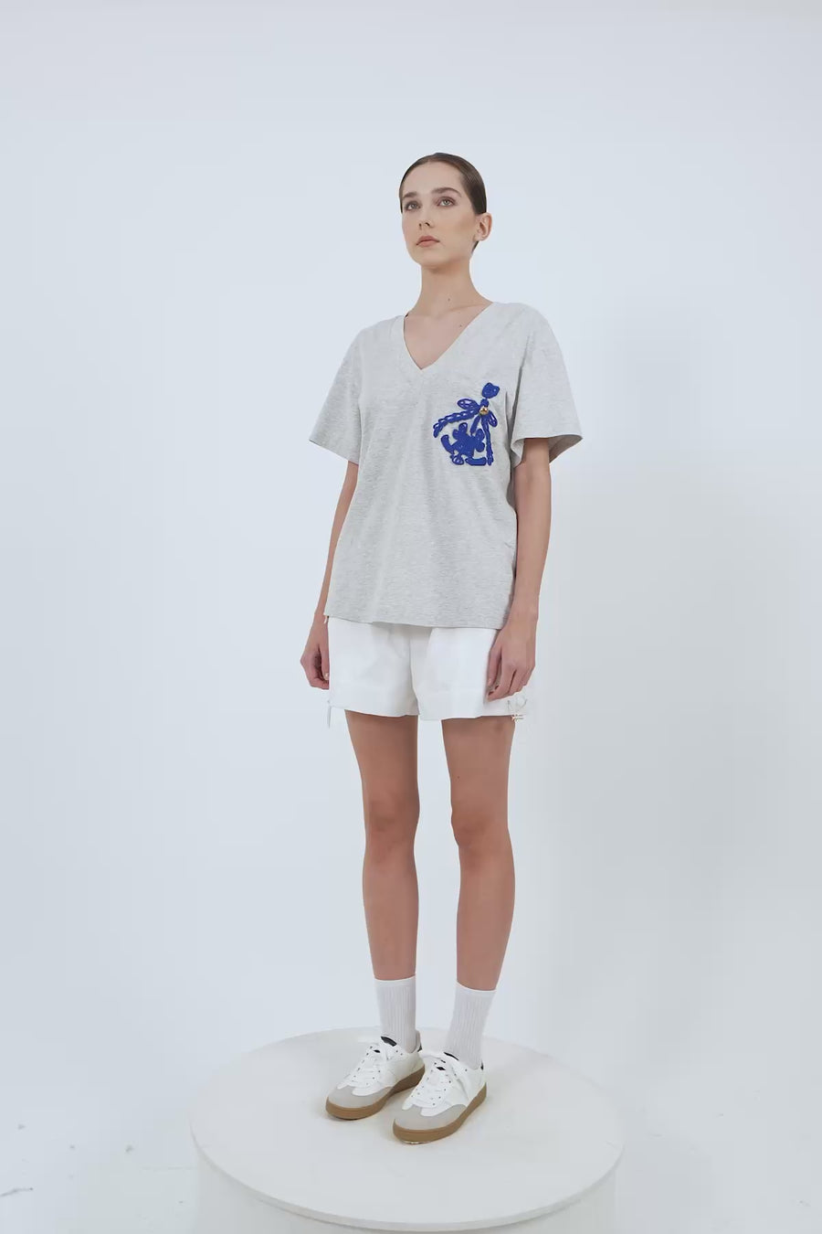 Cep Üstü Nakış Detaylı V Yaka Tişört