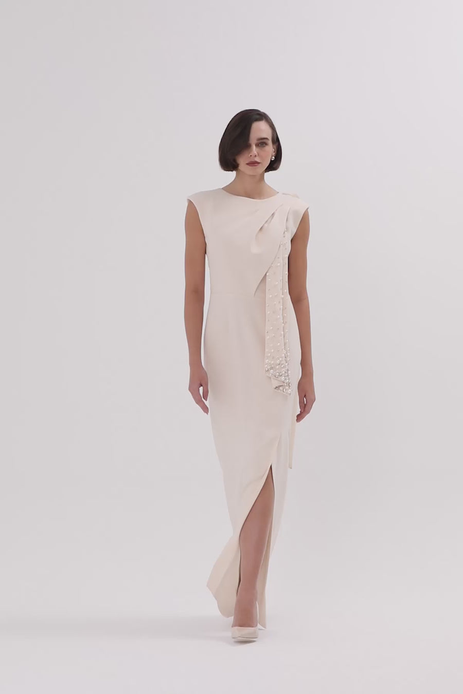 Yandan Piliseli, Arkadan Bağlama Detaylı Bej Yırtmaçlı Elbise