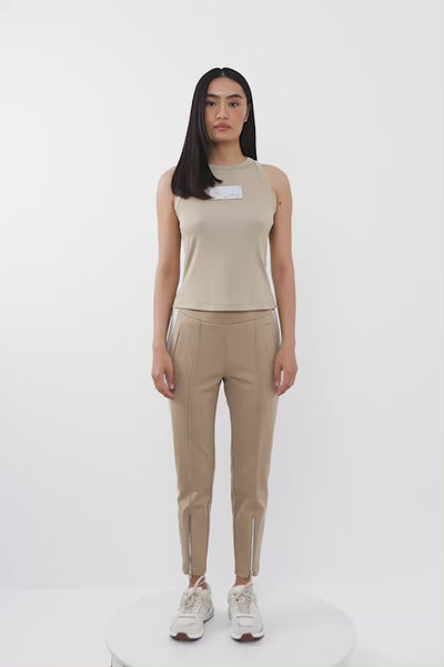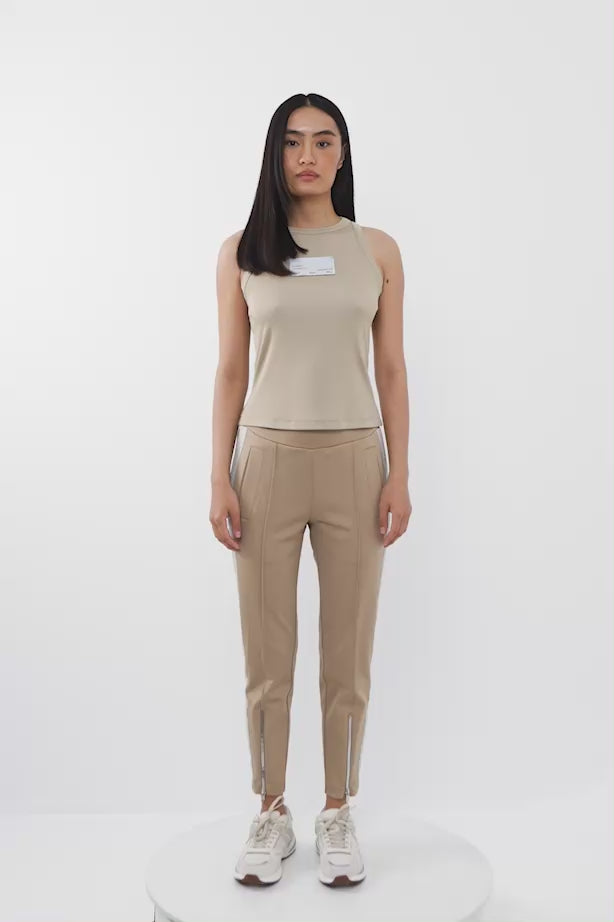 Arka Beden Etiket Detaylı Yanları Sim Şeritli Bej Pantolon