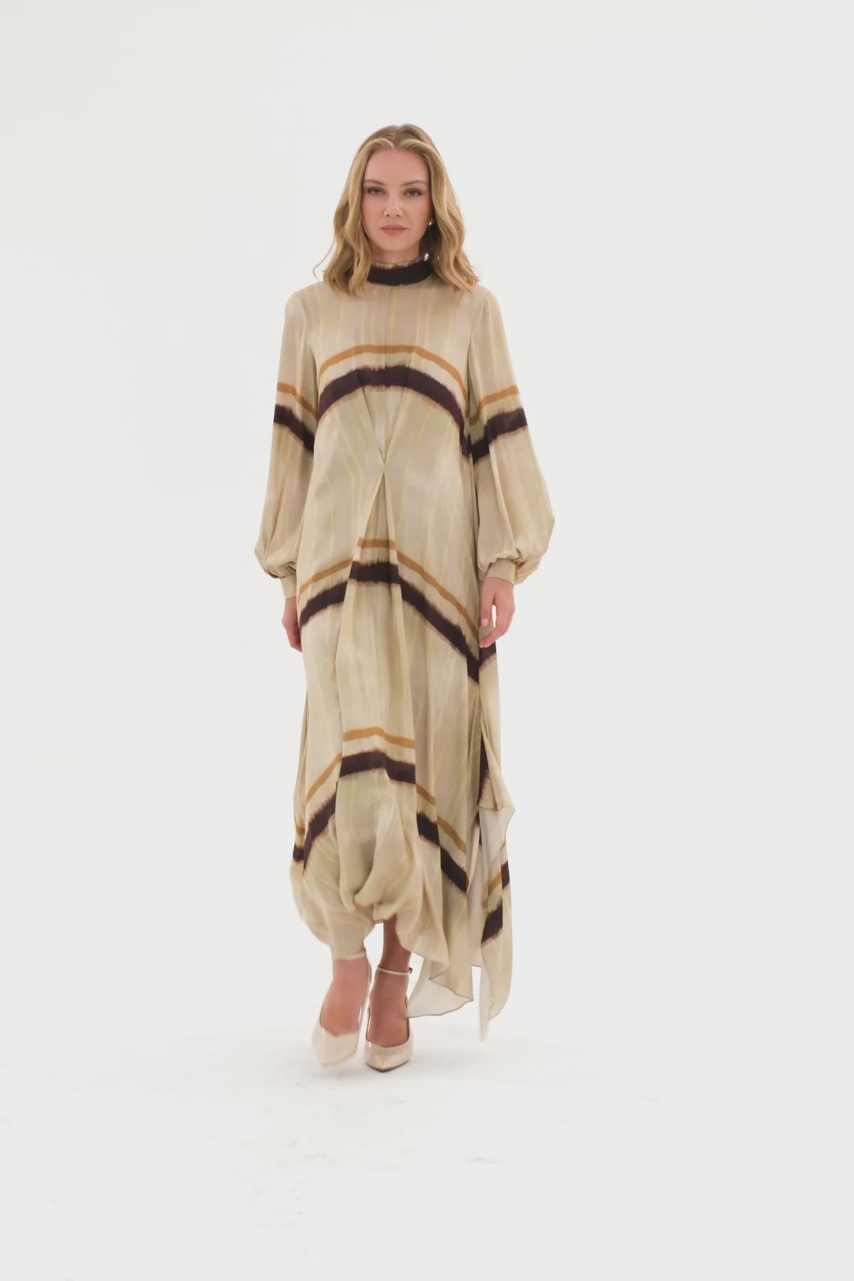 Arkadan Bağlamalı Uzun Kollu Astarlı Uzun Elbise