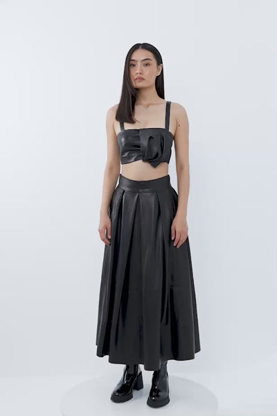 Arkadan Fermuarlı Askılı Deri Crop Top