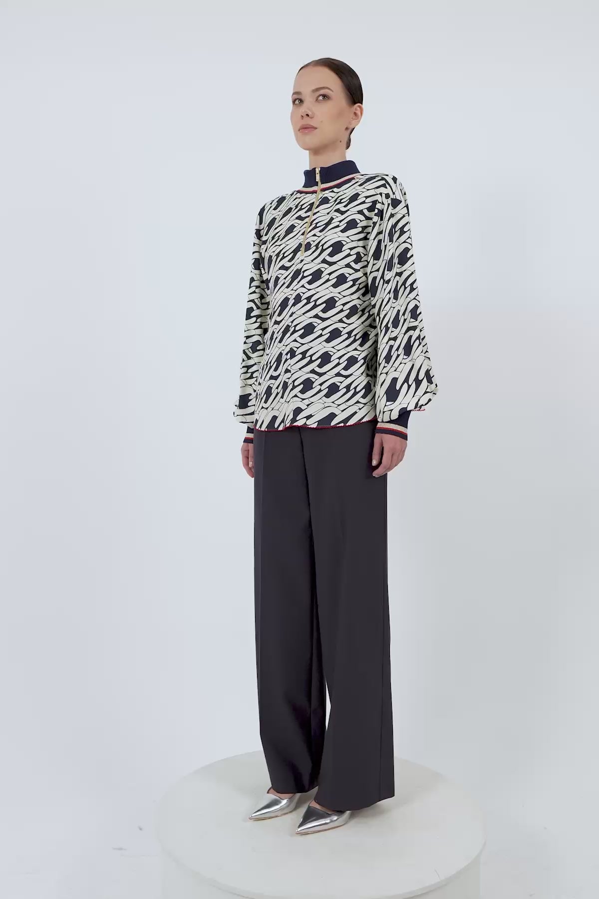 Arkası Fermuarlı Yaka Ve Manşet Triko Bantlı Etek Ucu Dikiş Detaylı Bluz
