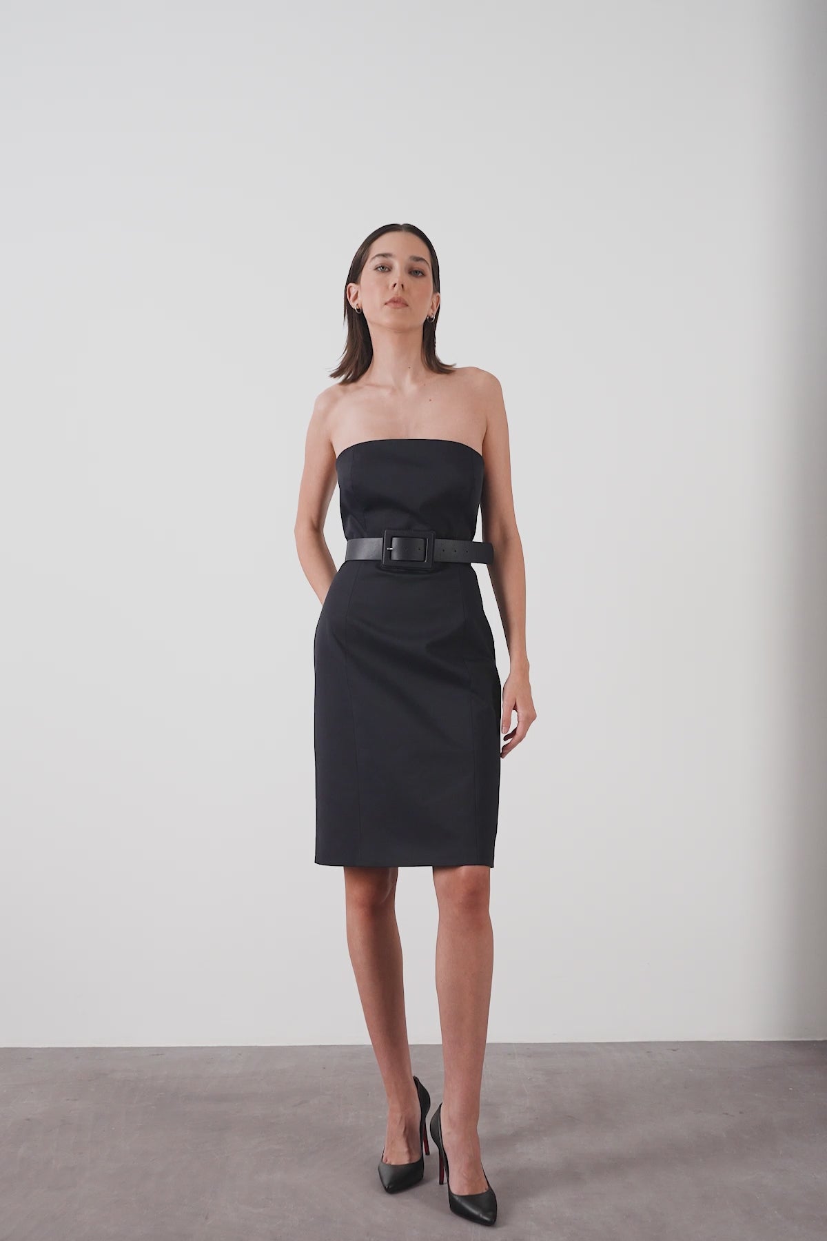 Arkası Yırtmaçlı Beli Deri Kemerli Straplez Kısa Elbise