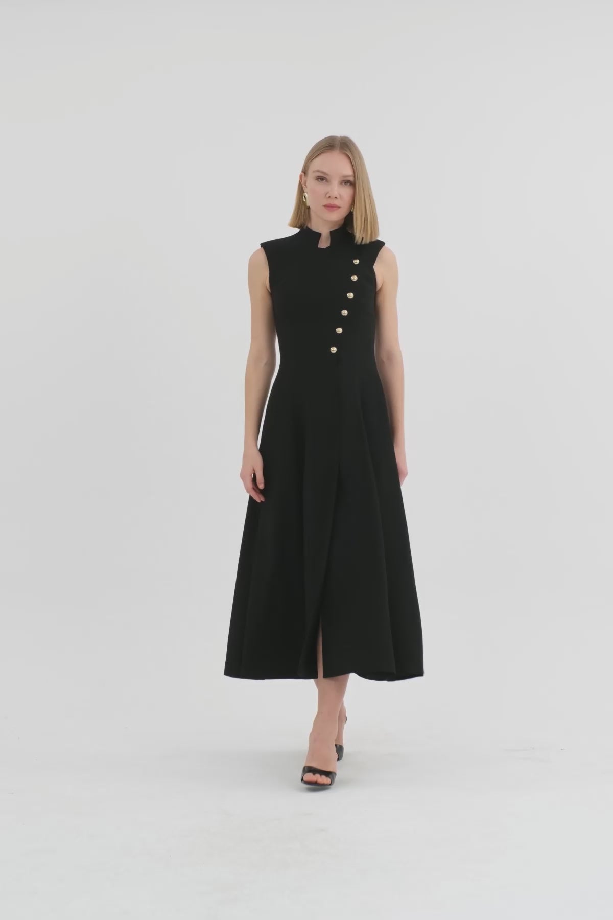 Asimetrik Düğmeli Midi Pileli Siyah Elbise