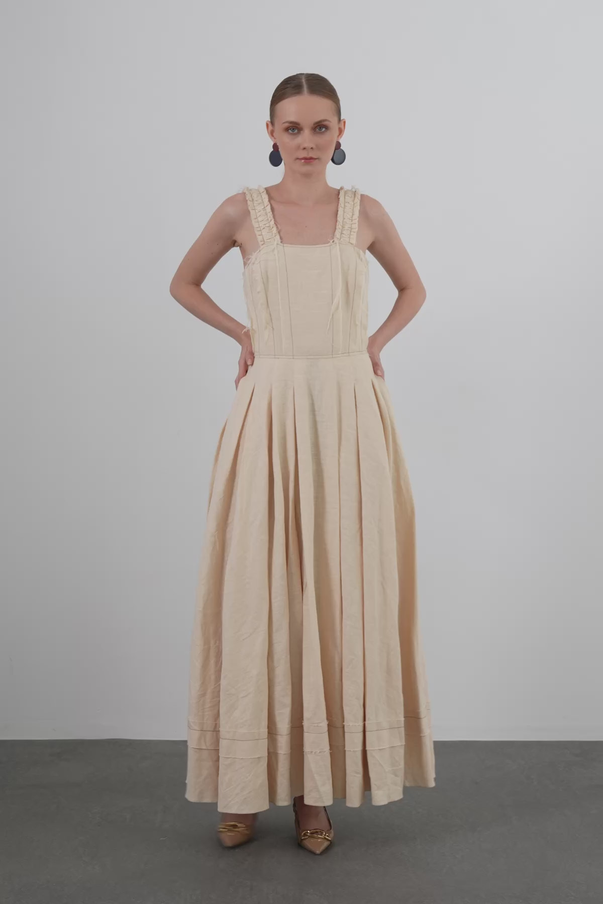 Askıları İşlemeli Eteği Pilikaşeli Uzun Elbise