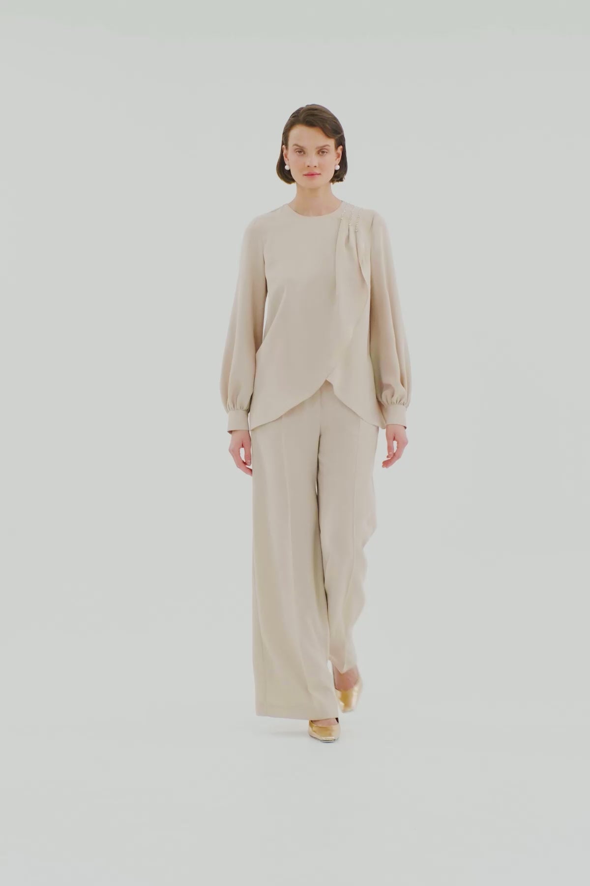Bej Asimetrik Bluz Pantolon Takım