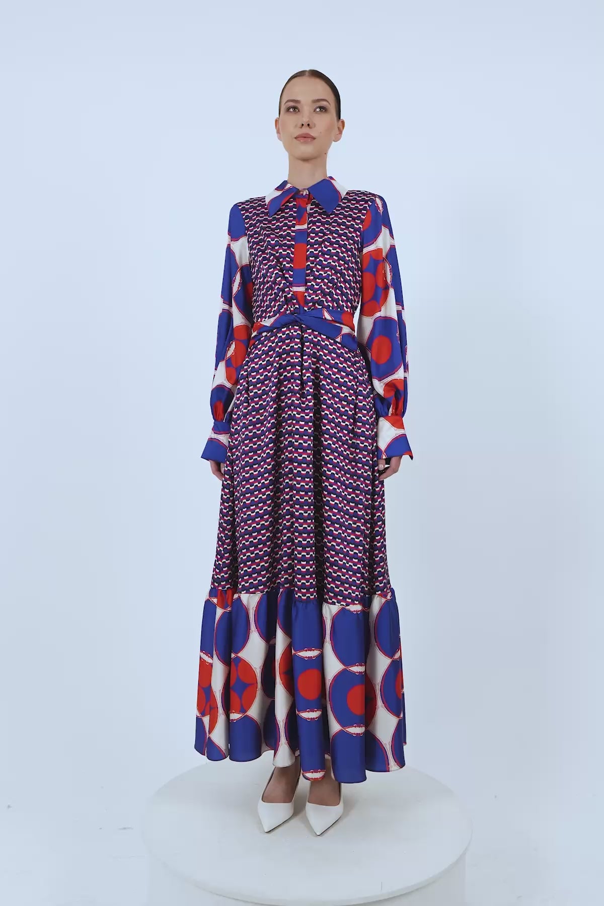 Beli Sabit Kuşaklı Gizli Kapama Uzun Desenli Elbise