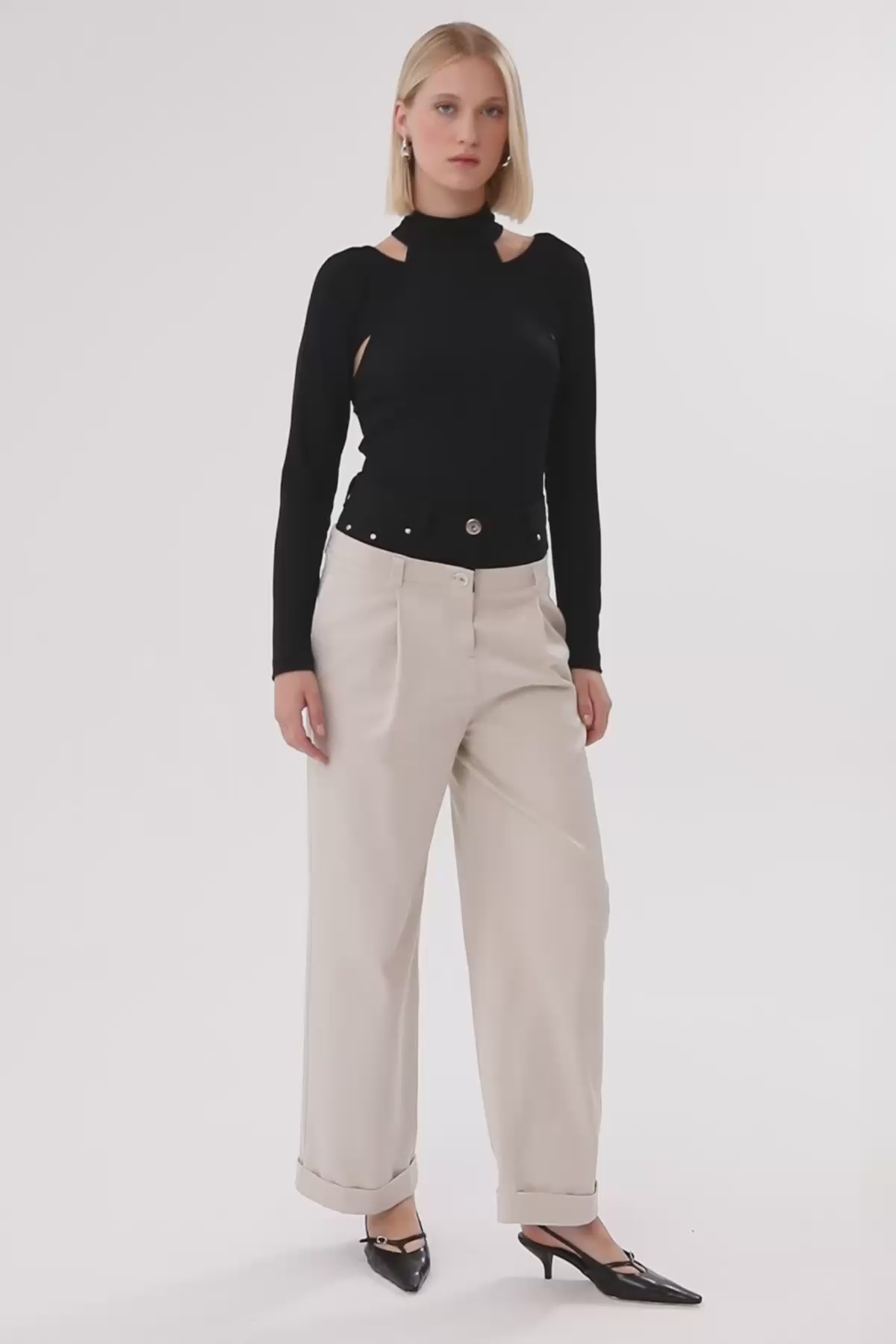 Belinde Garni Lazerli Jean Detaylı Önden Pileli Geniş Paçalı Pantolon