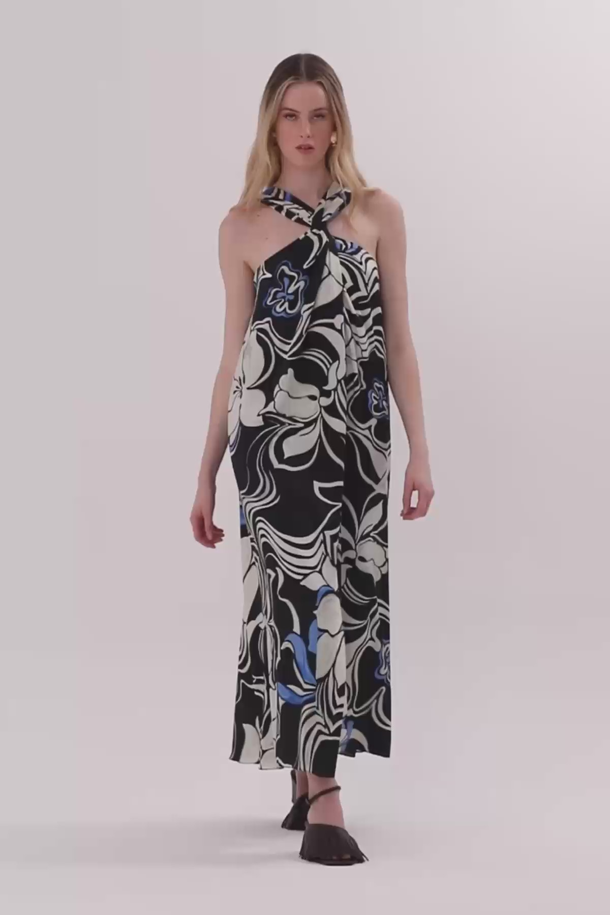 Boyundan Bağlama Detaylı Desenli Uzun Elbise