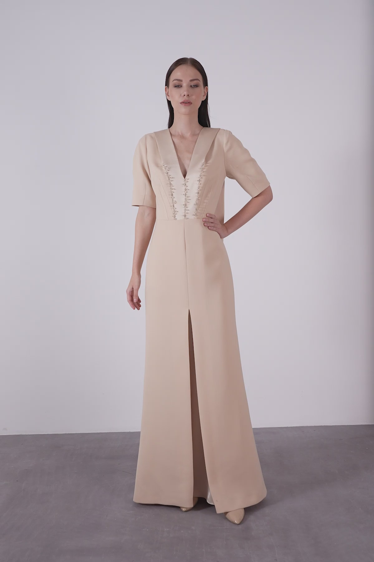 Boyundan Bağlama Detaylı İşlemeli V Yaka Uzun Elbise