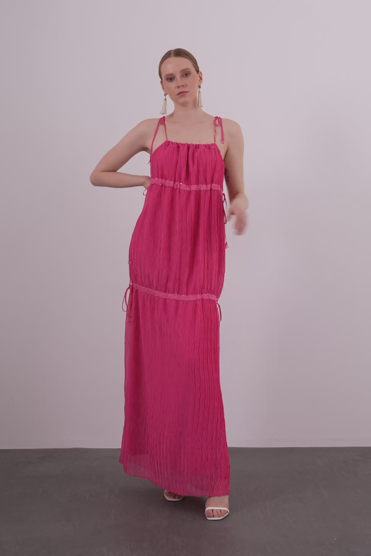 Boyundan Bağlamalı Büzülebilir Katmanlı Uzun Elbise