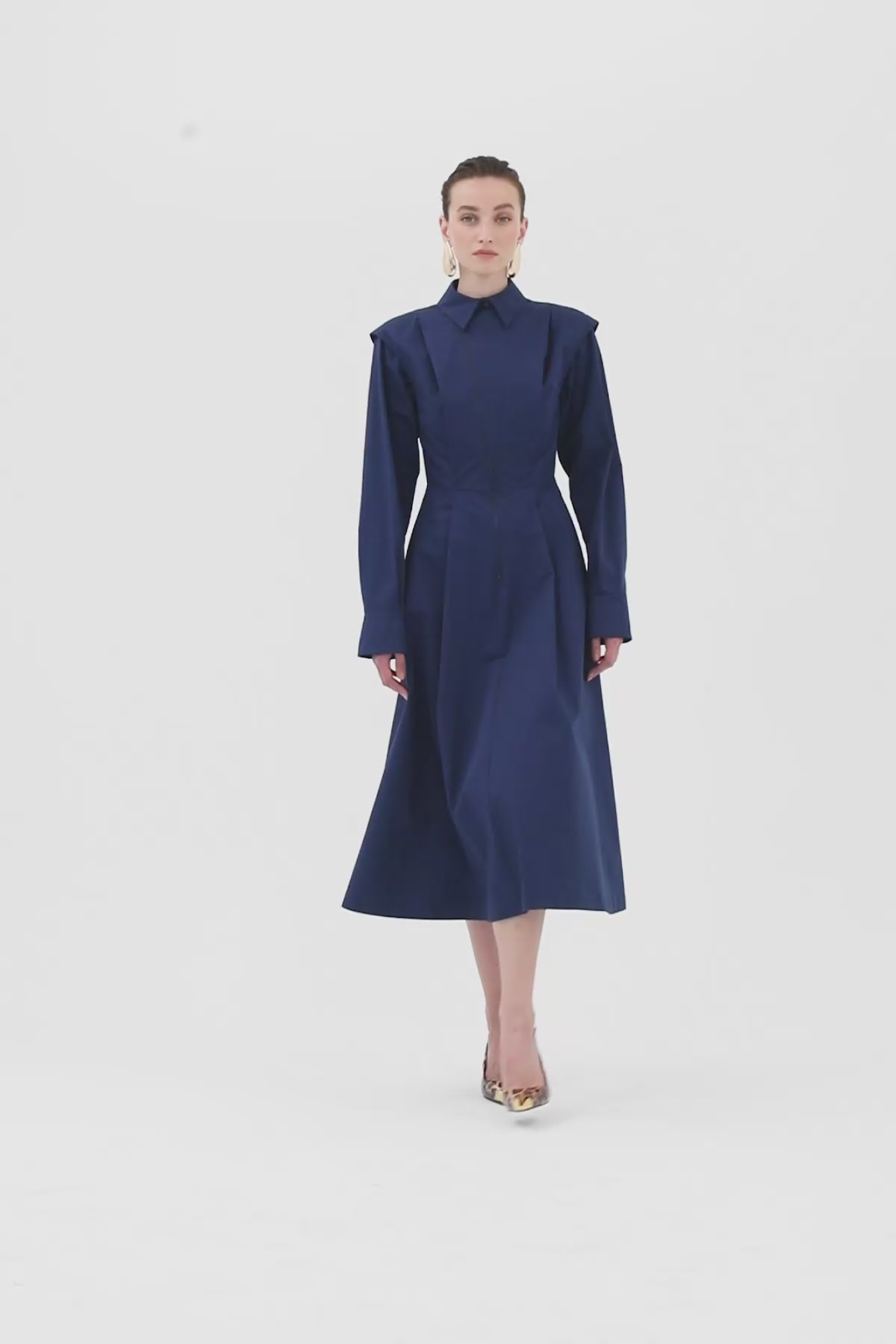 Gömlek Yaka Asimetrik Fermuar Kapamalı Pileli Midi Elbise