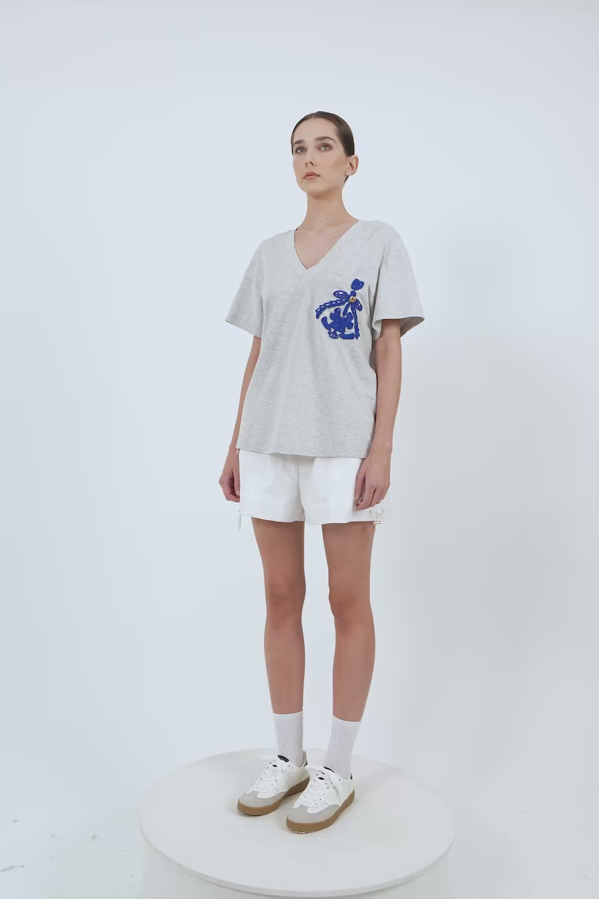 Cep Üstü Nakış Detaylı V Yaka T-shirt