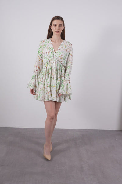 Çiçek Desenli V Yaka Uzun Kollu Elbise
