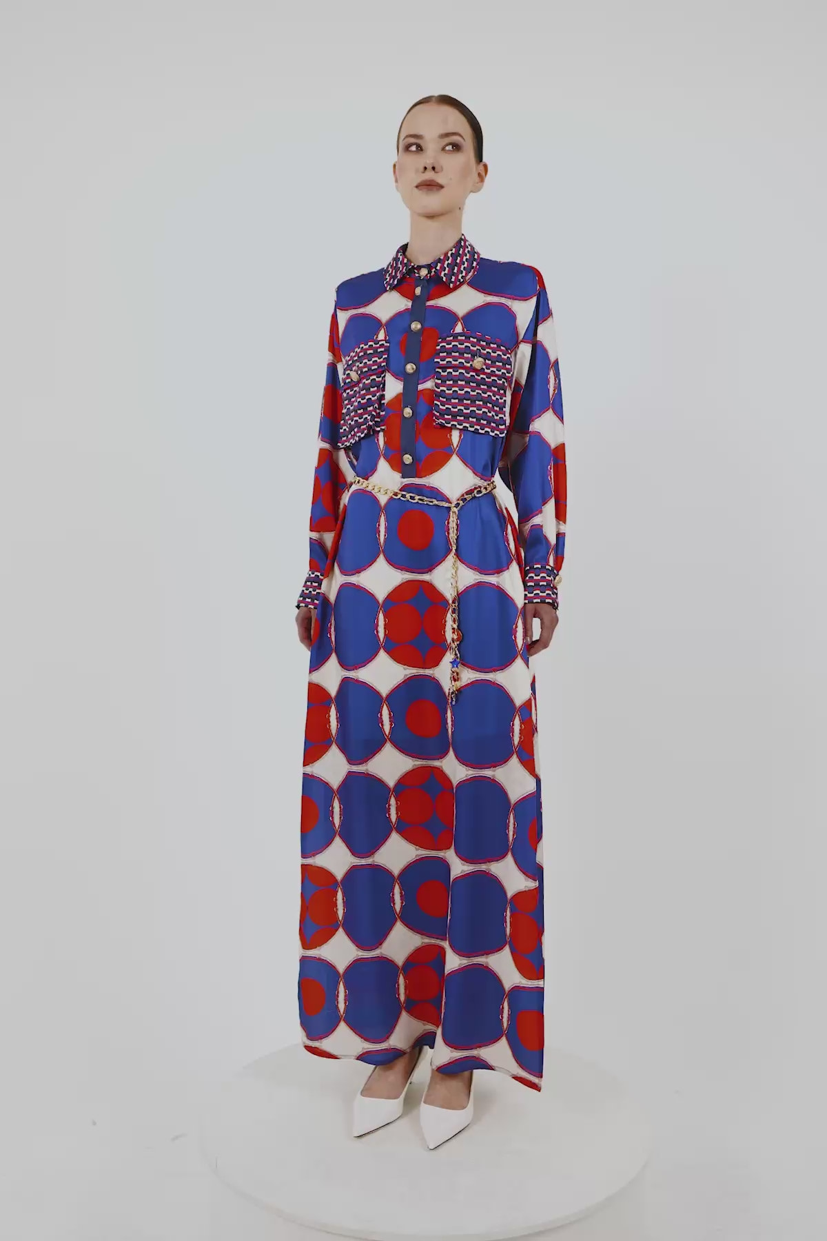 Çıkarılabilir Zincir Kemer Detaylı Düğmeli Uzun Desenli Elbise