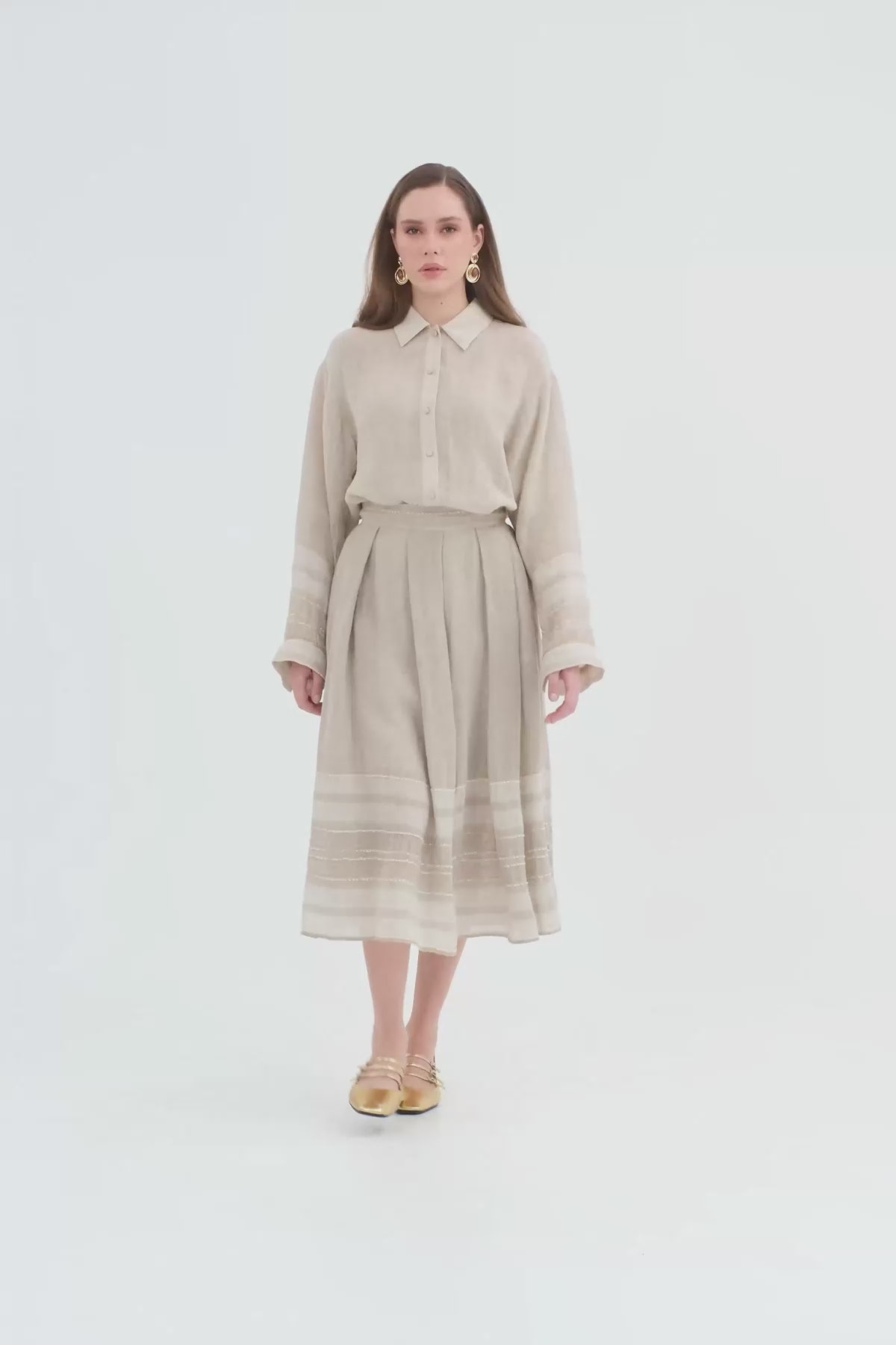 Çizgi Desenli Midi Bej Etek