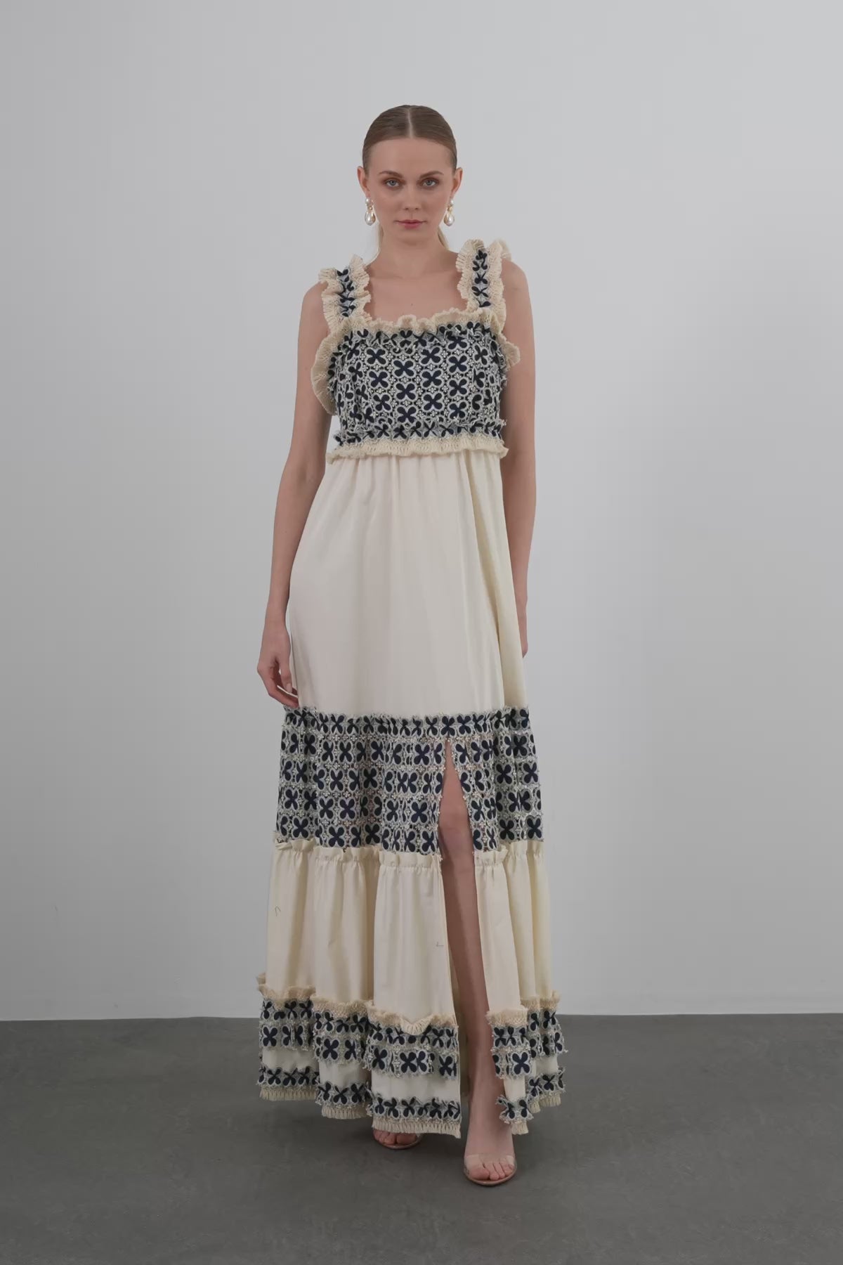 Dantel Detaylı Askılı Uzun Elbise