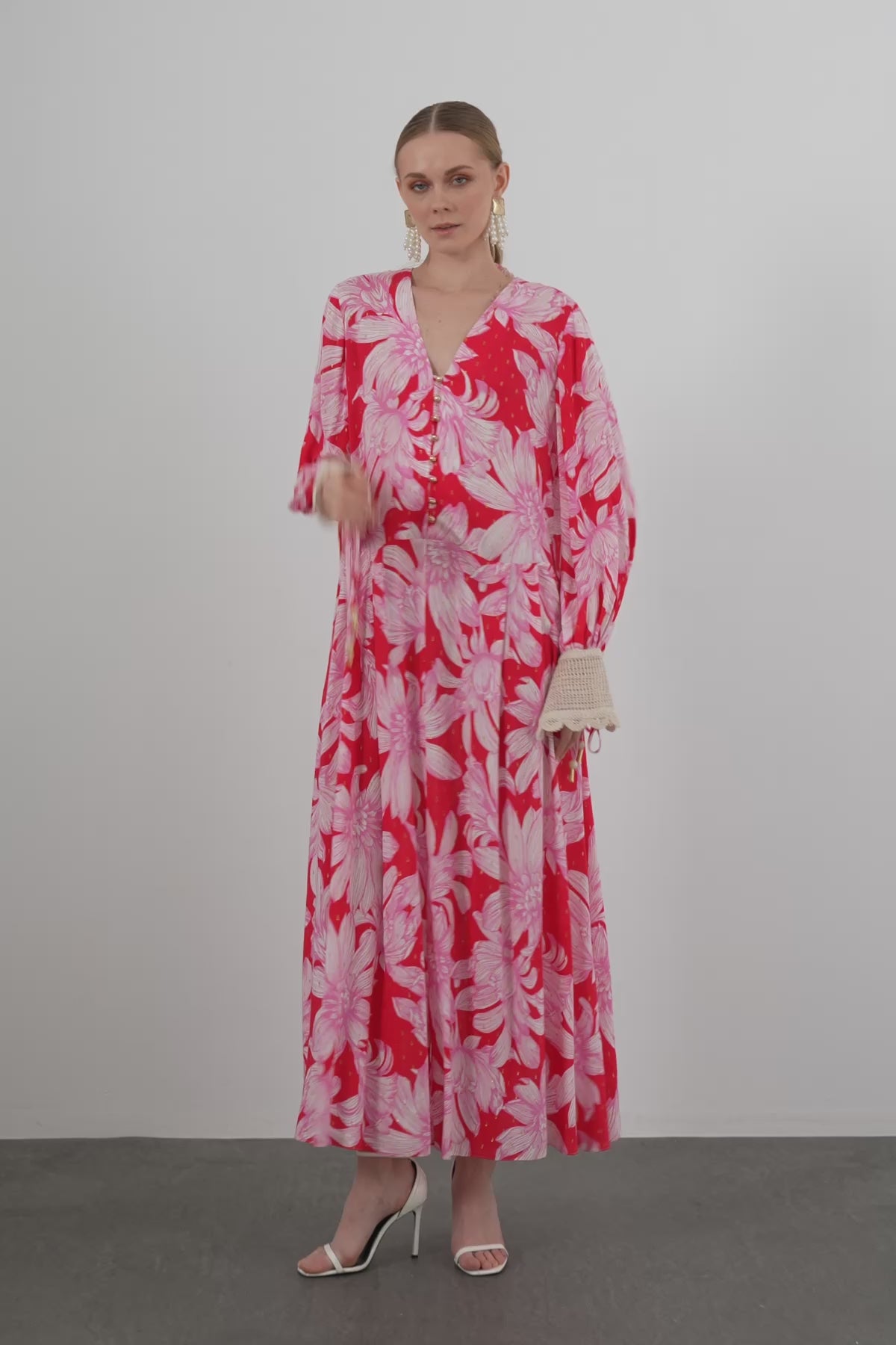 Dantel Detaylı Belden Pileli Uzun Kollu Uzun Elbise
