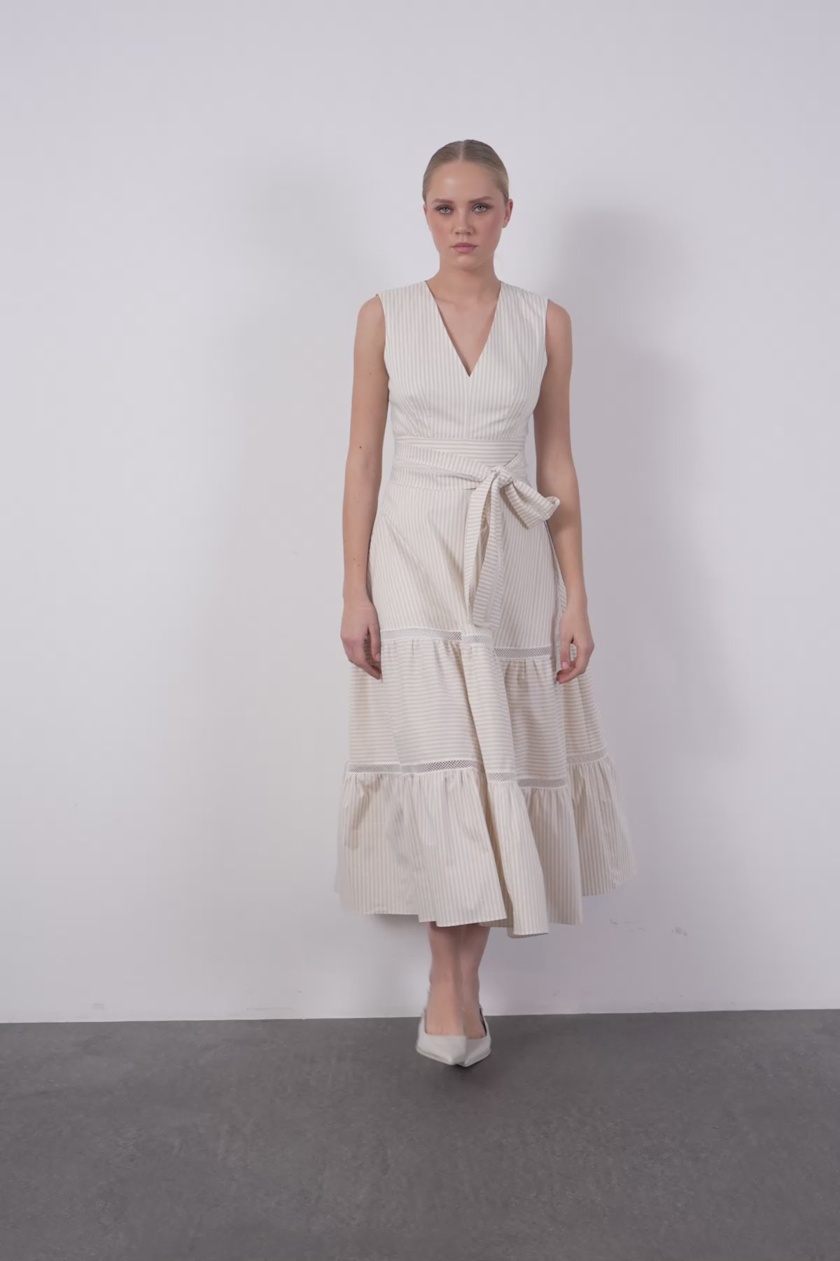 Dantel Detaylı Kolsuz Kuşaklı Poplin Midi Elbise