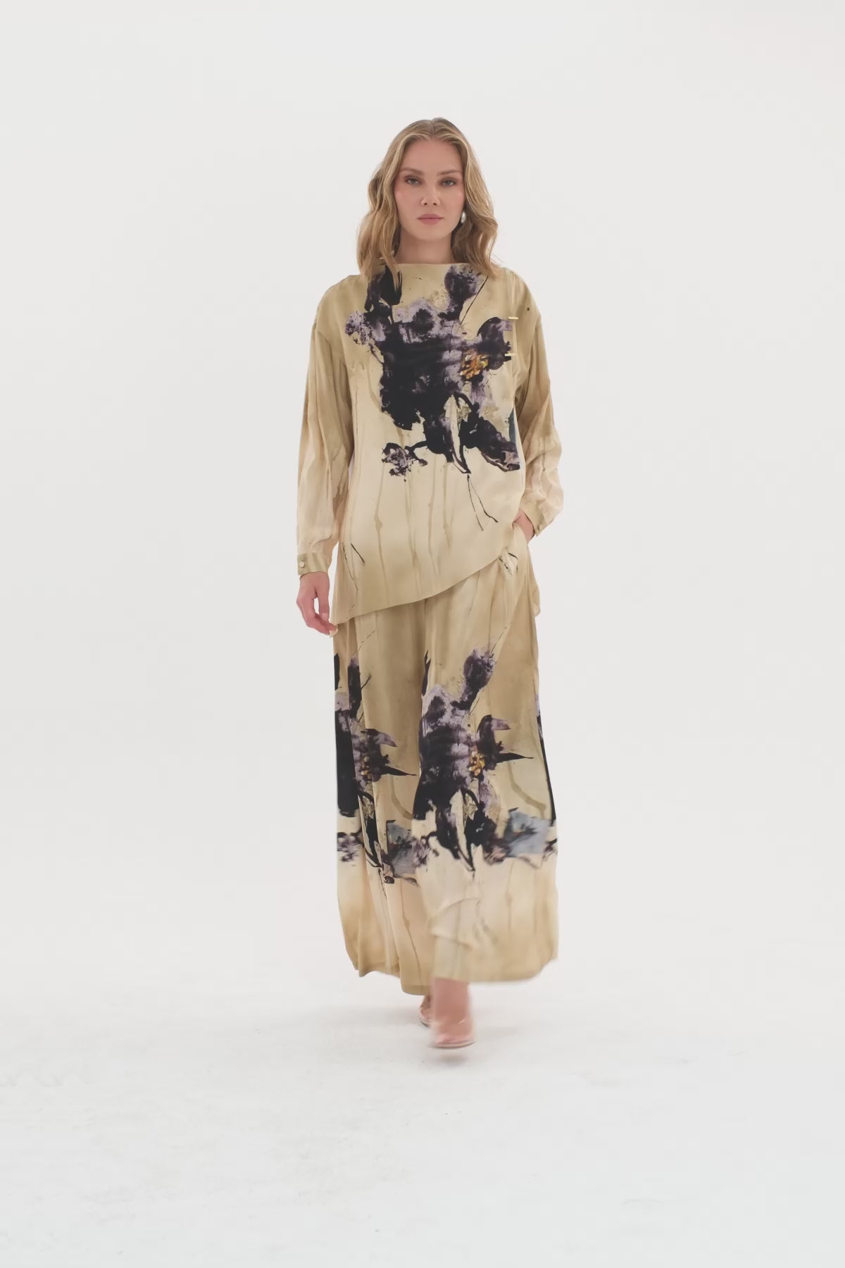 Kayık Yakalı Aksesuar Detaylı Desenli Viskon Bluz
