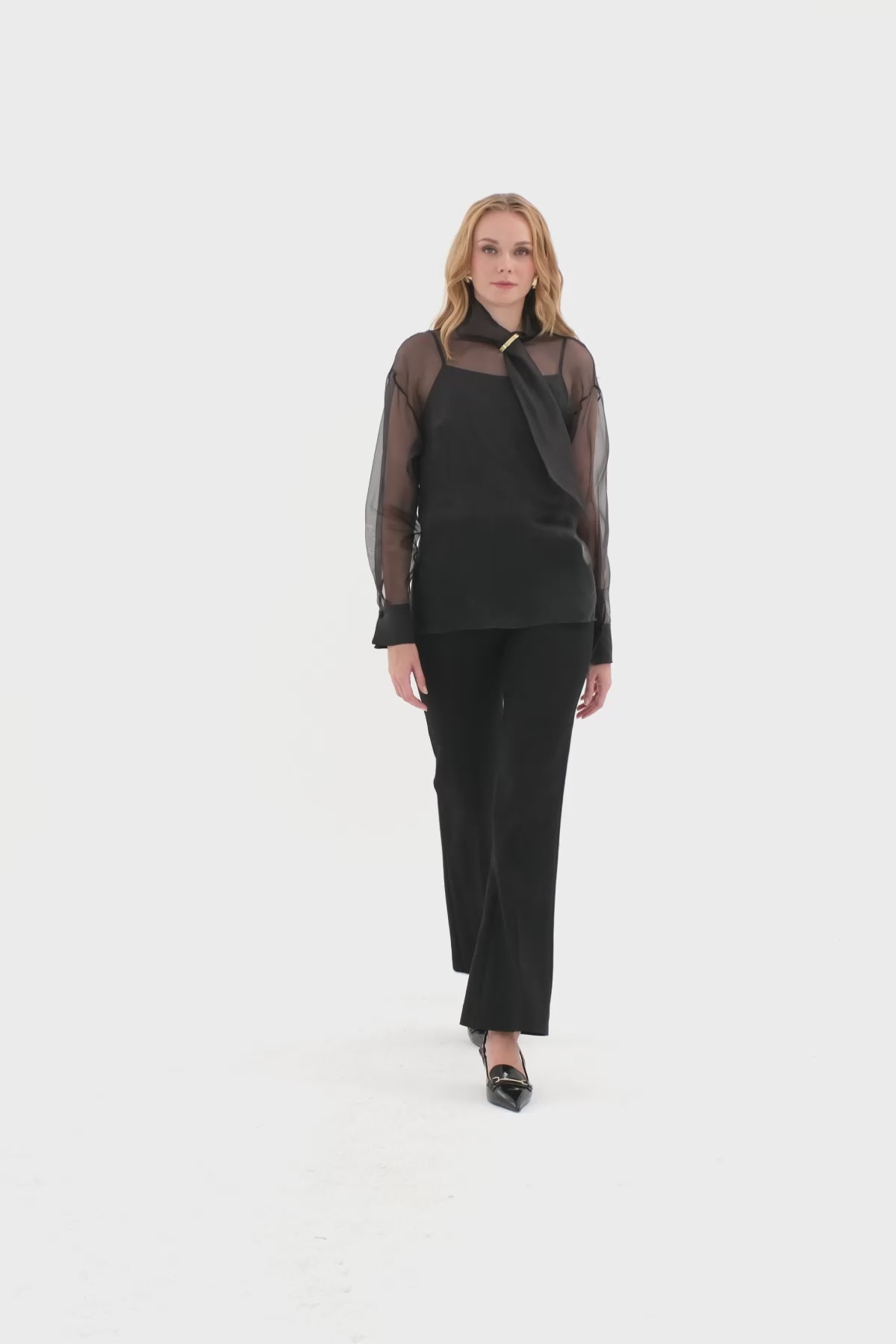 Dik Yakalı Arka Orta Düğme Kapamalı Transparan Bluz