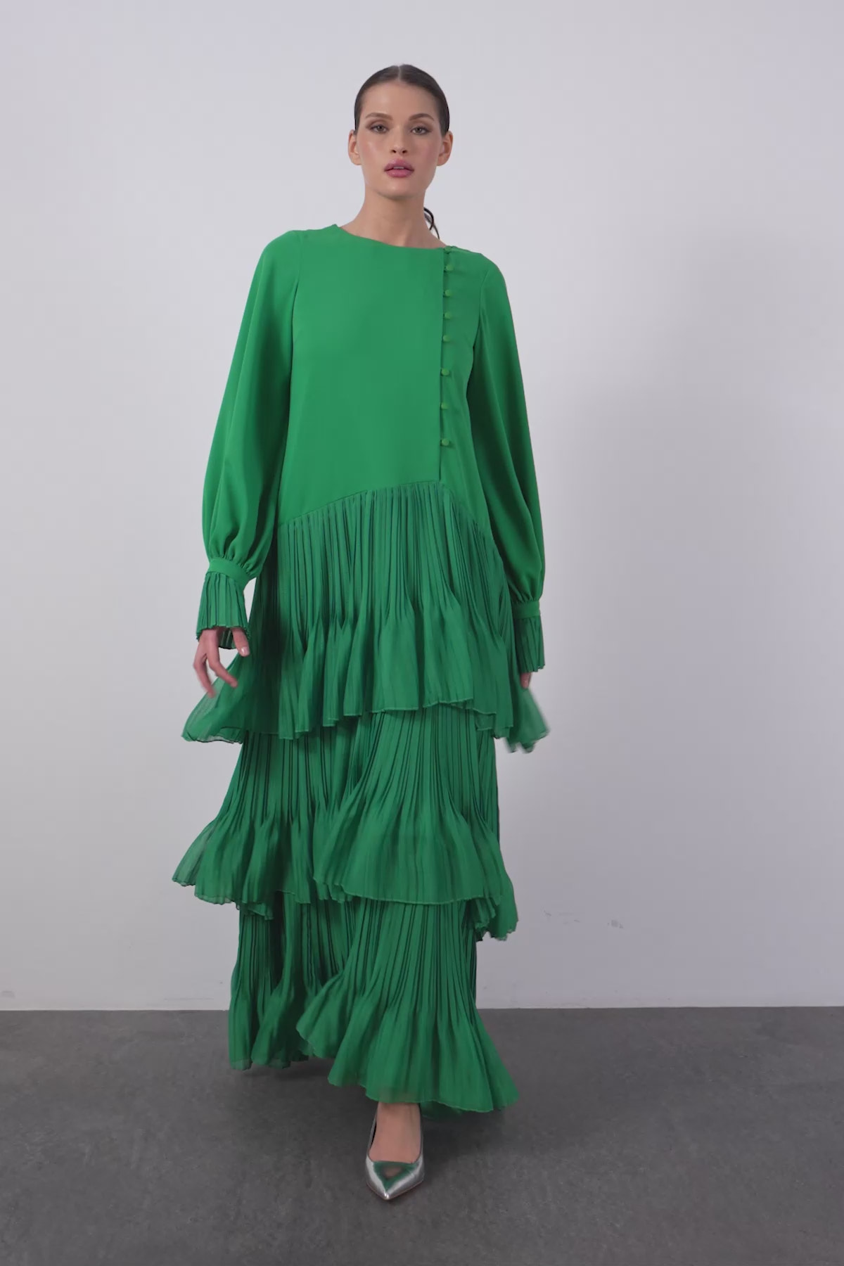 Düğme Detaylı Etekucu Piliseli Uzun Elbise