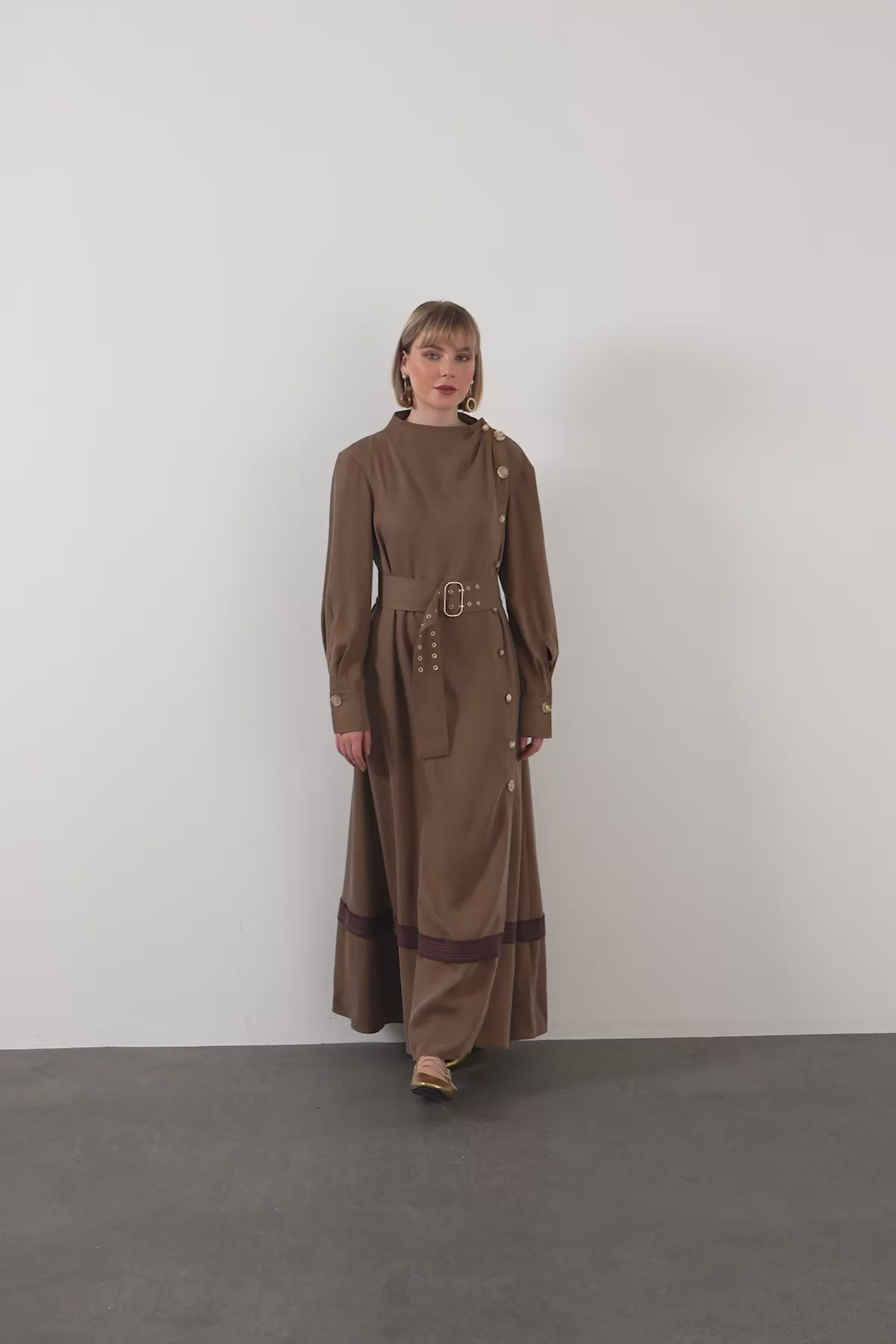 Düğme Detaylı Seyyar Kuşaklı Uzun Elbise