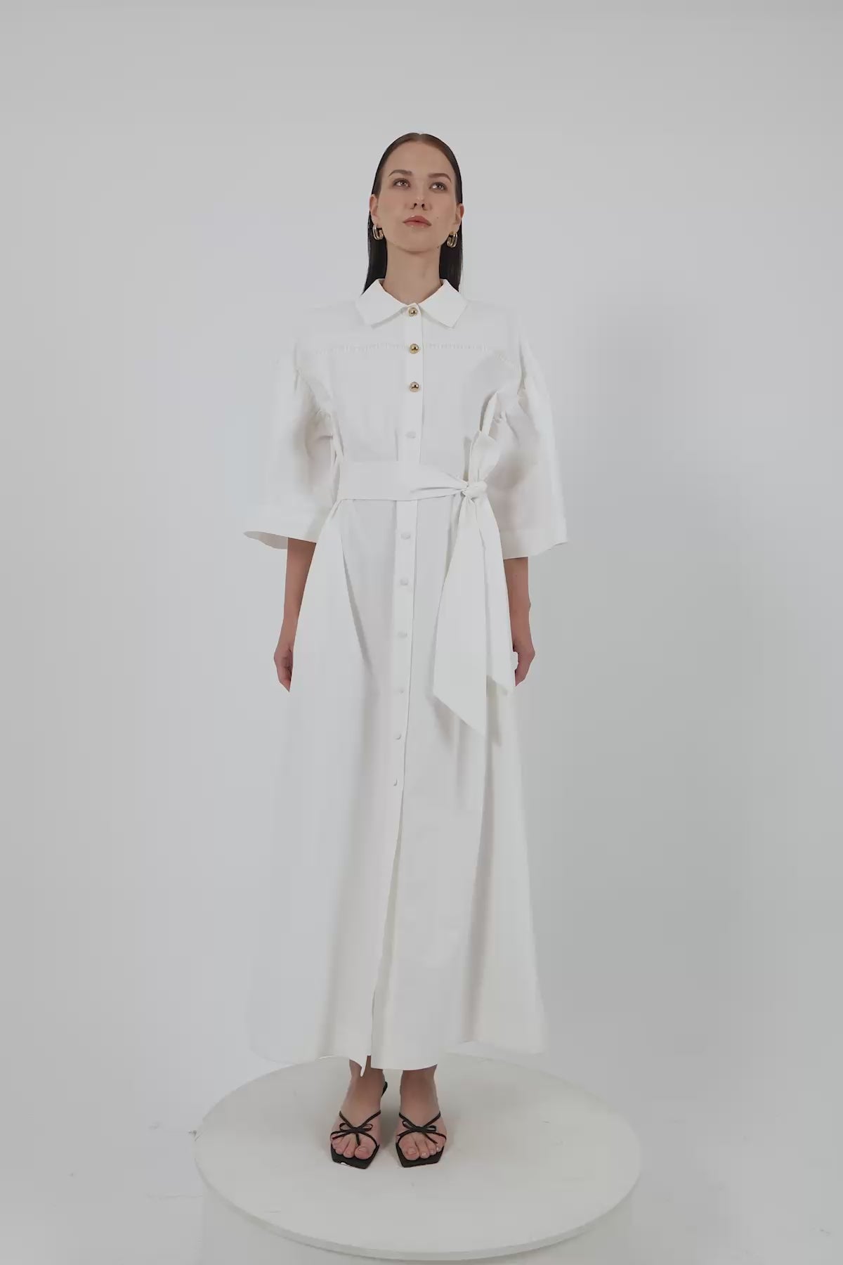 Düğmedetaylı Kuşaklı Poplin Uzun Elbise